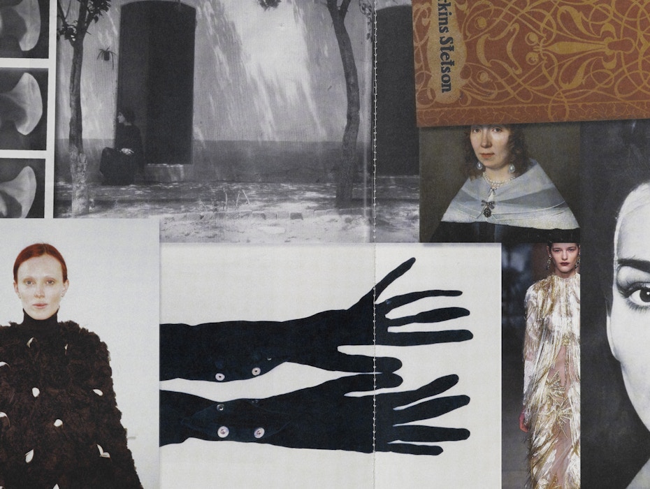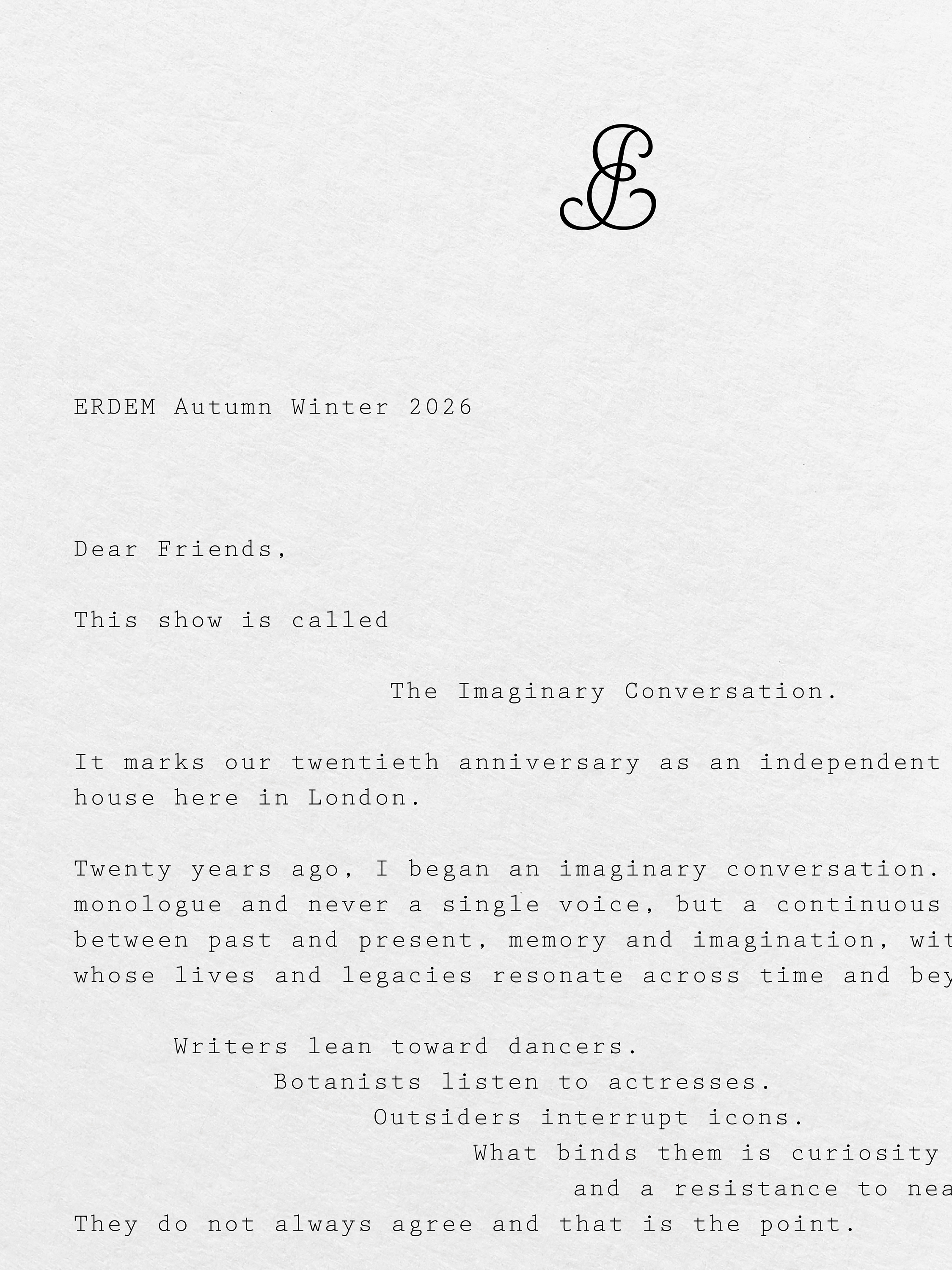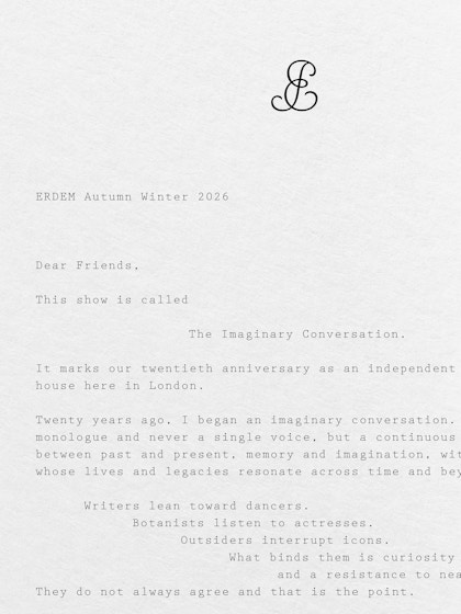 The marque was introduced as part of Erdem’s Autumn Winter 2026 collection, appearing as printed silk bookplates on the sleeves of tailored pieces and on the cover of a large-format zine. We developed the zine to mark twenty years of the house, bringing together inspirations and muses in a dense collage of imagery.