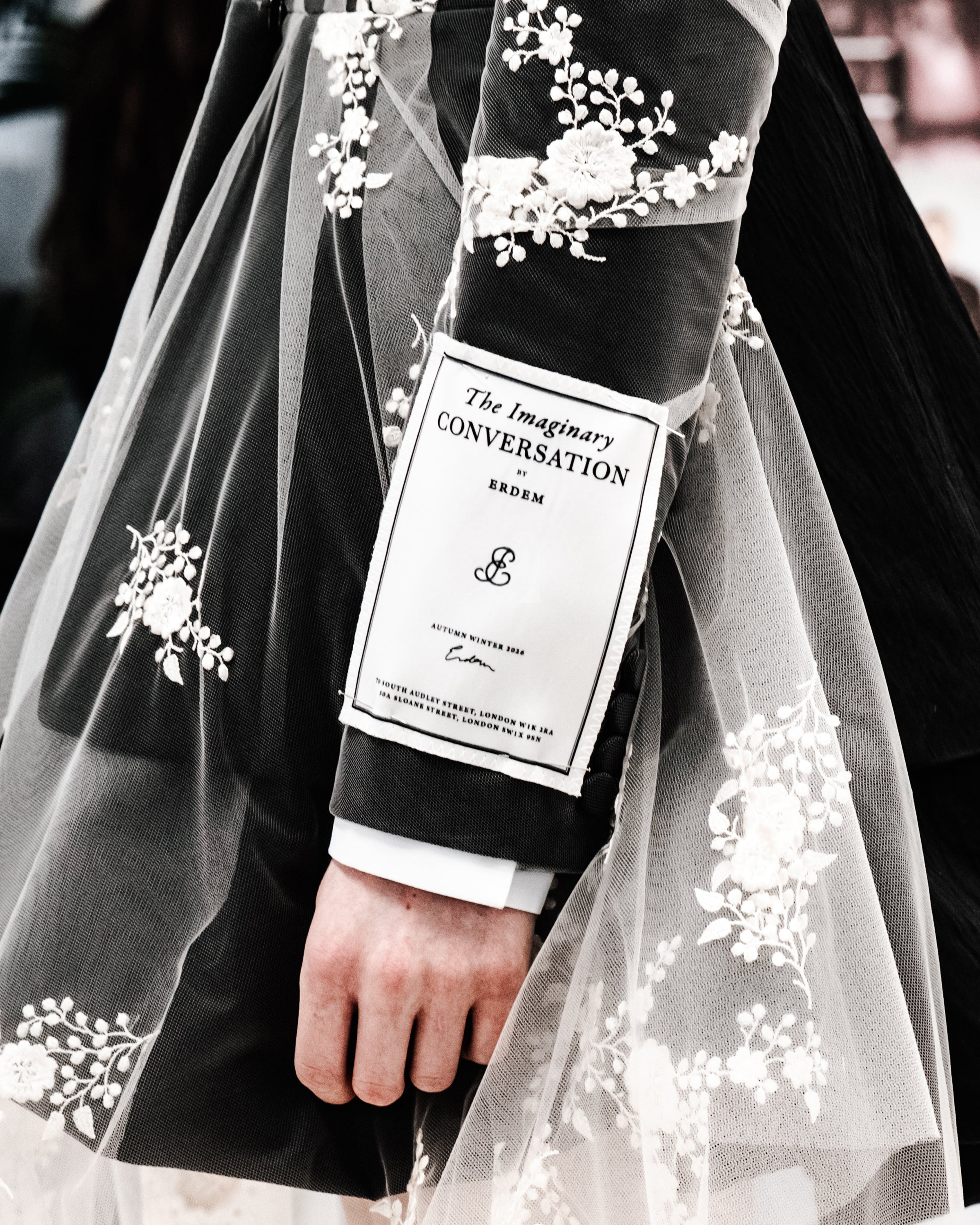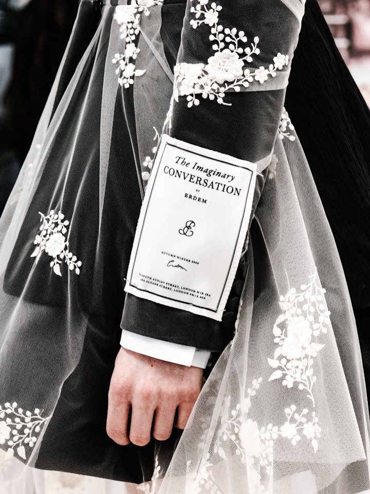 Garments are wrapped in glassine paper, a material more commonly used to preserve artworks. The paper features a self-portrait by artist Ilse Bing (1899–1998), in which she is both photographer and muse. Influenced by Erdem’s layering of historic and contemporary inspirations in his designs, the packaging also includes quotations by Emily Dickinson (1830–86).