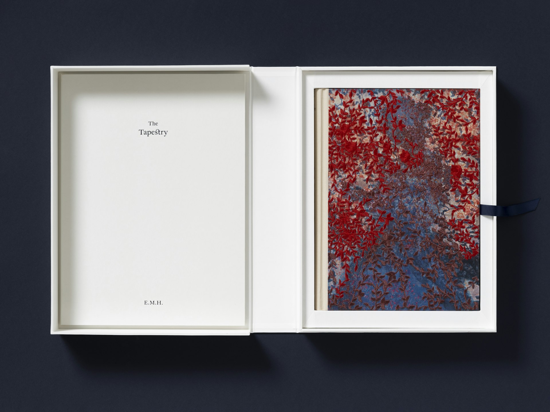 The book is published in two editions, each cloth bound and featuring a new work by Heck on the cover. For the special edition, the cover is printed and overlaid with intricate two-tone embroidery, then housed in a custom portfolio. Its distinctly tactile nature echoes that of Heck’s work.