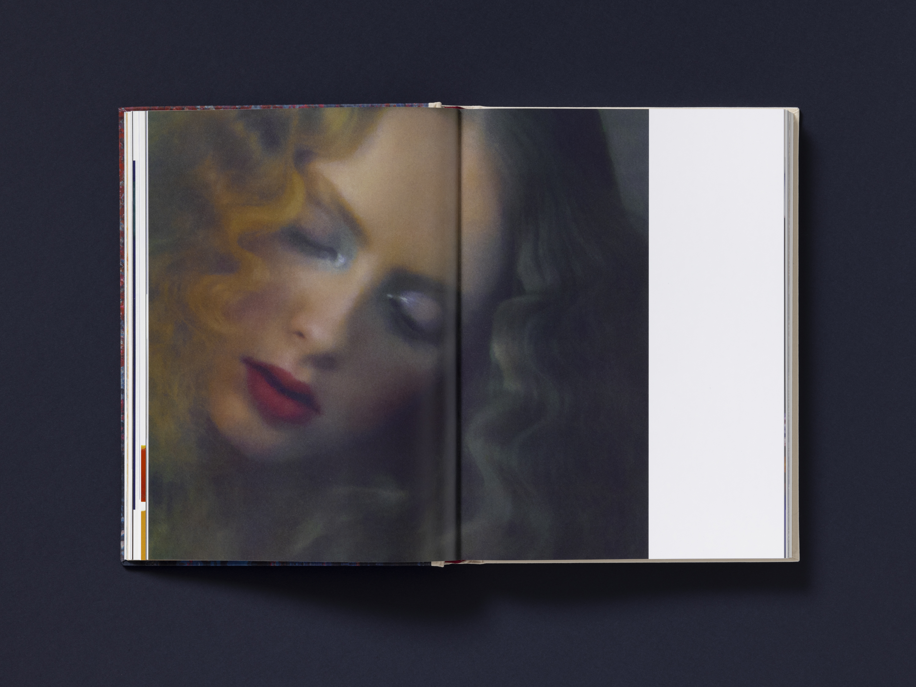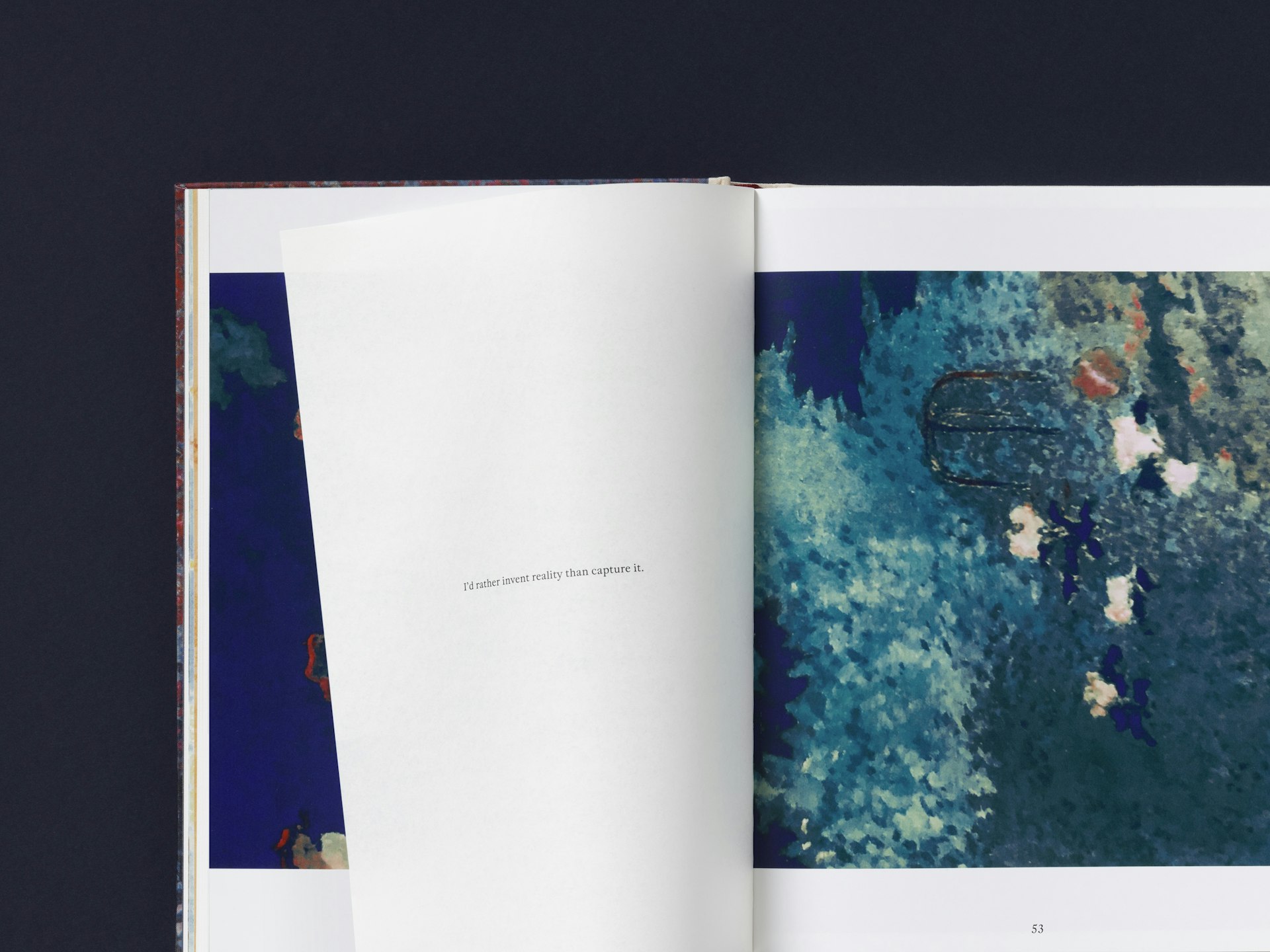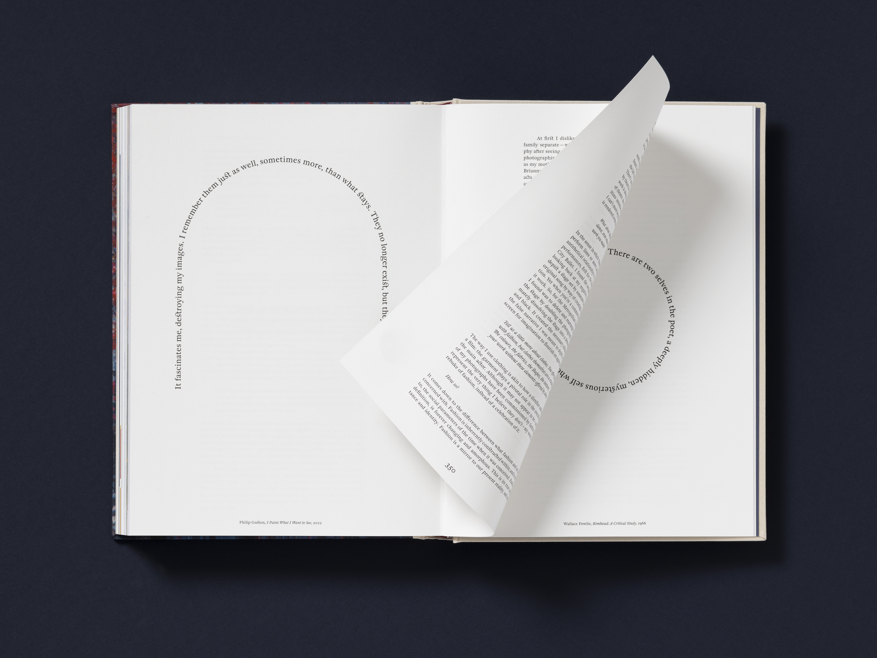 Developed with Heck, the image sequencing creates dialogue across fifteen paper stocks, from high gloss to uncoated. Coloured dividers mark each section, with related quotations printed on semi transparent tip ins. Additional elements include a double gatefold and a cut short, letter-like section. The OTA bound softcover is housed in a paper wrapped slipcase with foiled type and a debossed tip-on plate.
