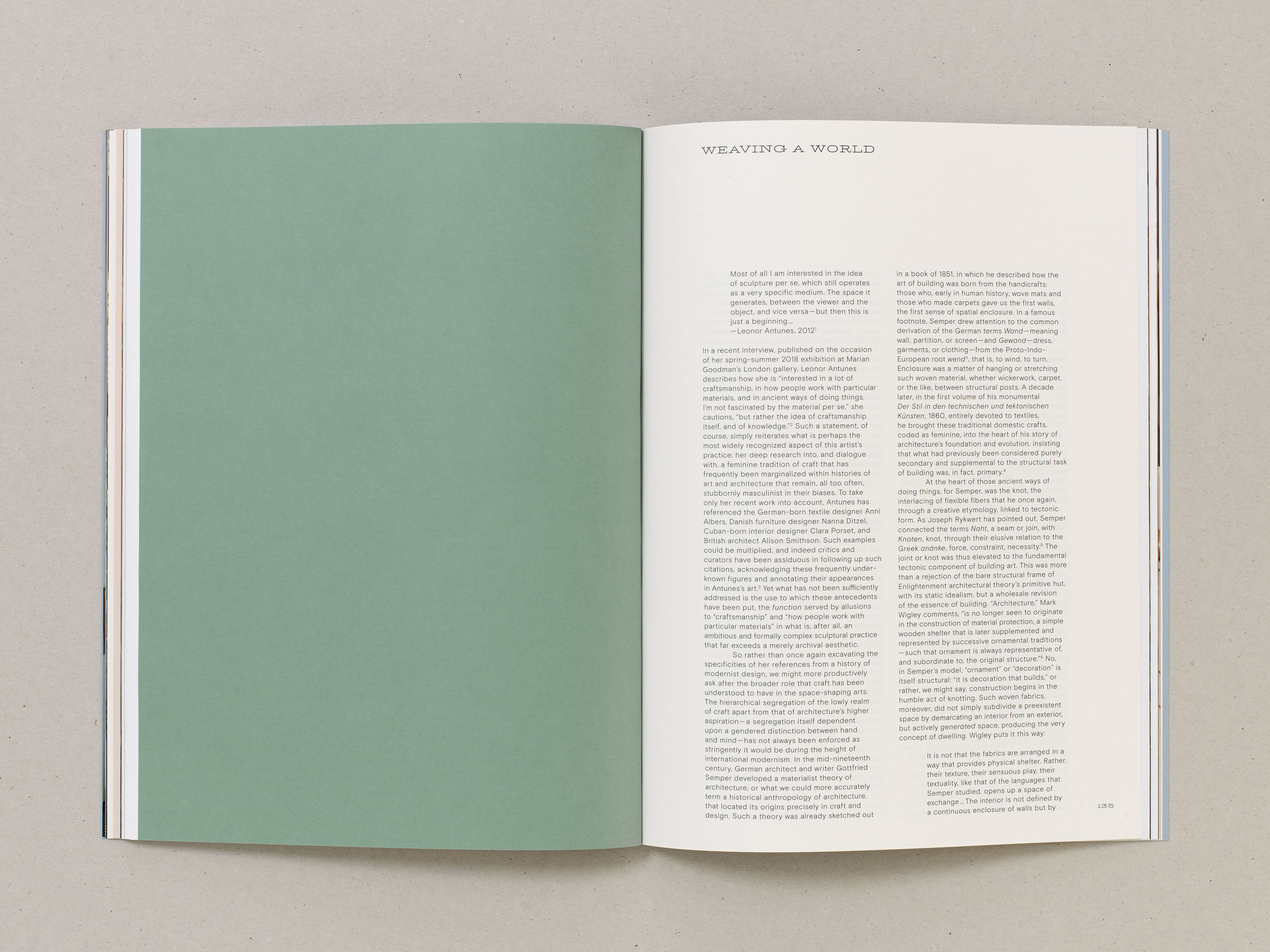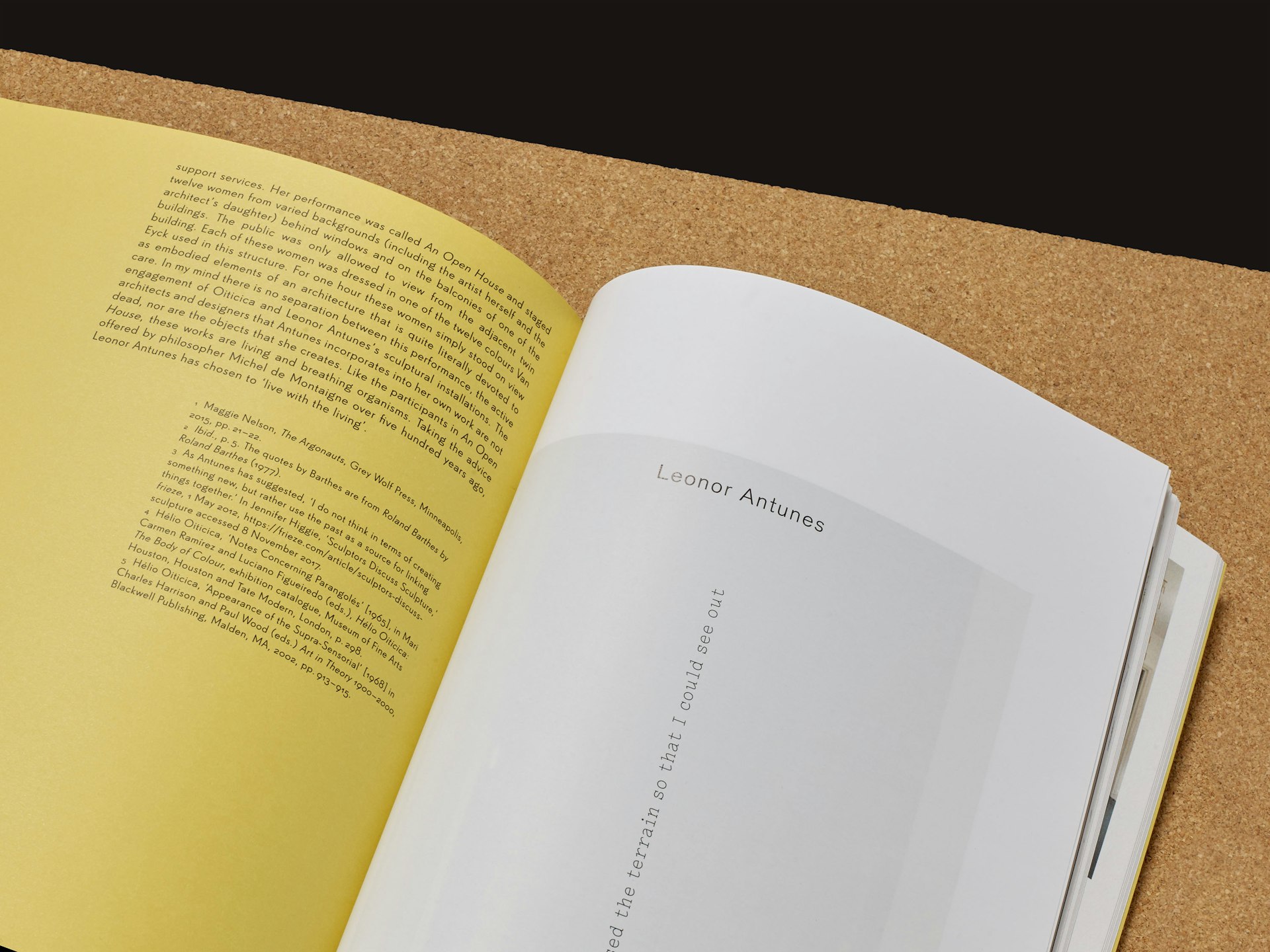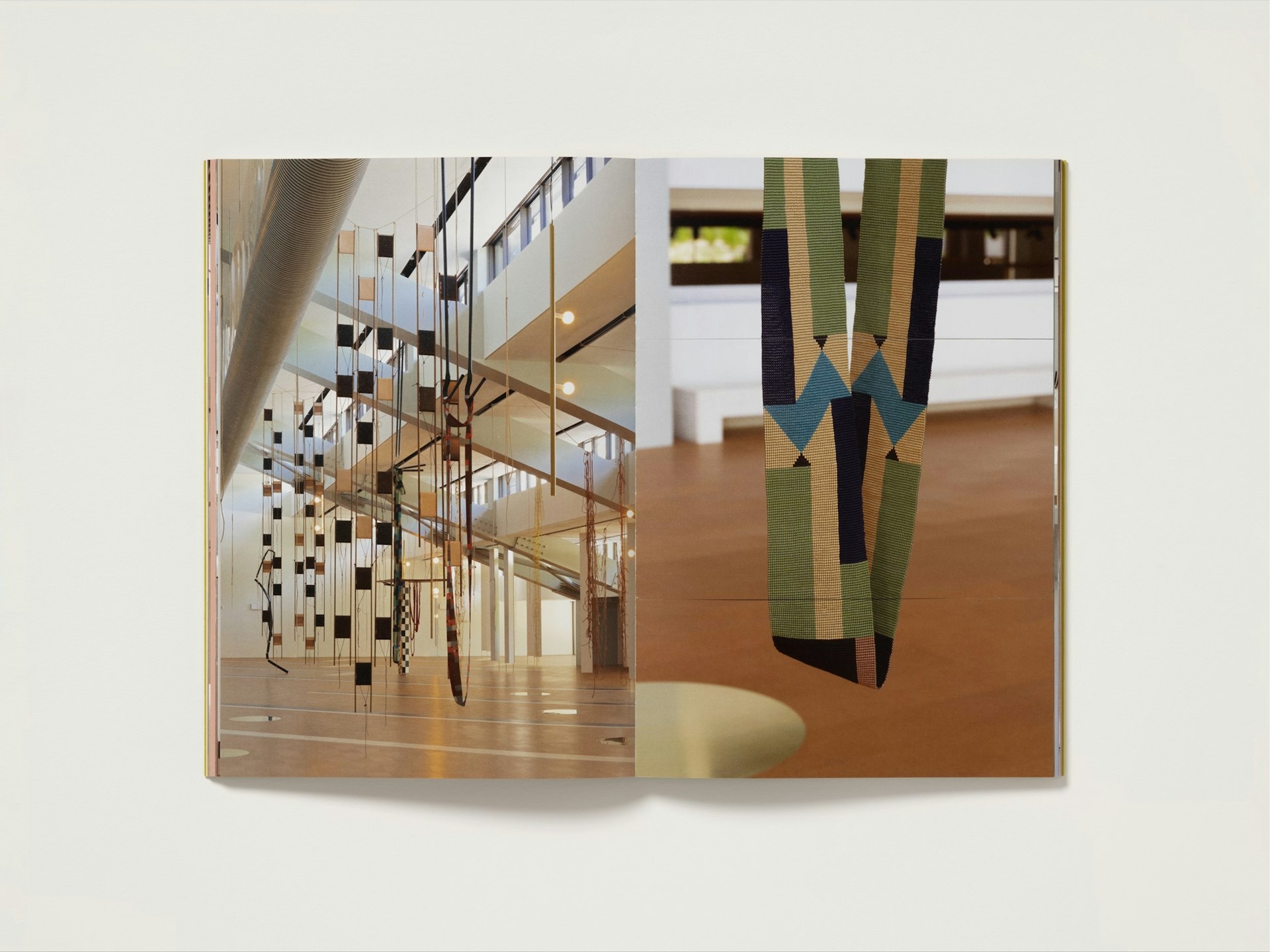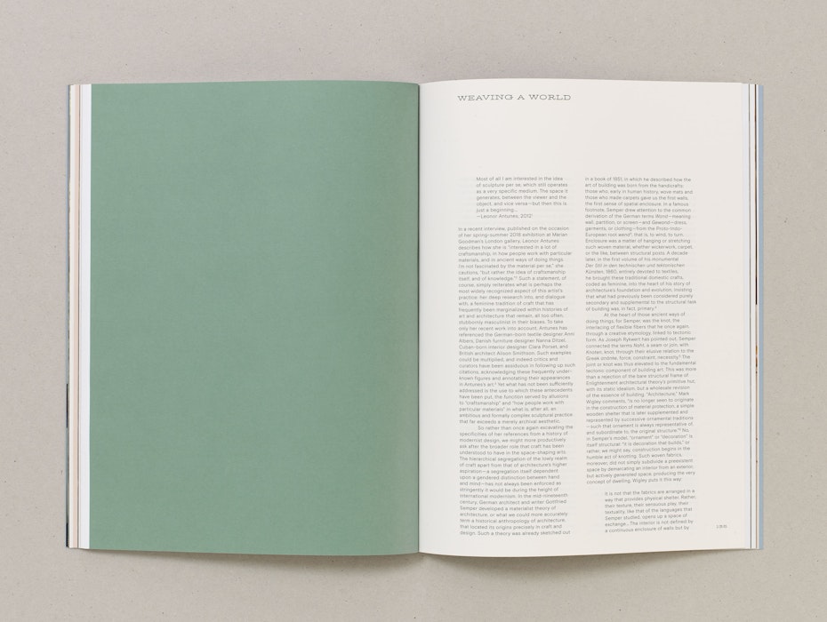 The book’s design takes inspiration from The Flat Book (1939) by Sadie Speight and Leslie Martin, architects of CAM’s historic building. Its colours, grid and format anchor the publication within the lineage of modernist design. Italic serif typography draws on archival language and references. By alternating between forward and backward slanted italics, the design points to both past and future, mirroring how the exhibition spans from the 1930s to the present day. When stacked, the layered italic glyphs form a visual weave that references Antunes’s sculptures. Inside, spliced pages echo her woven works and extend the interplay between artworks.