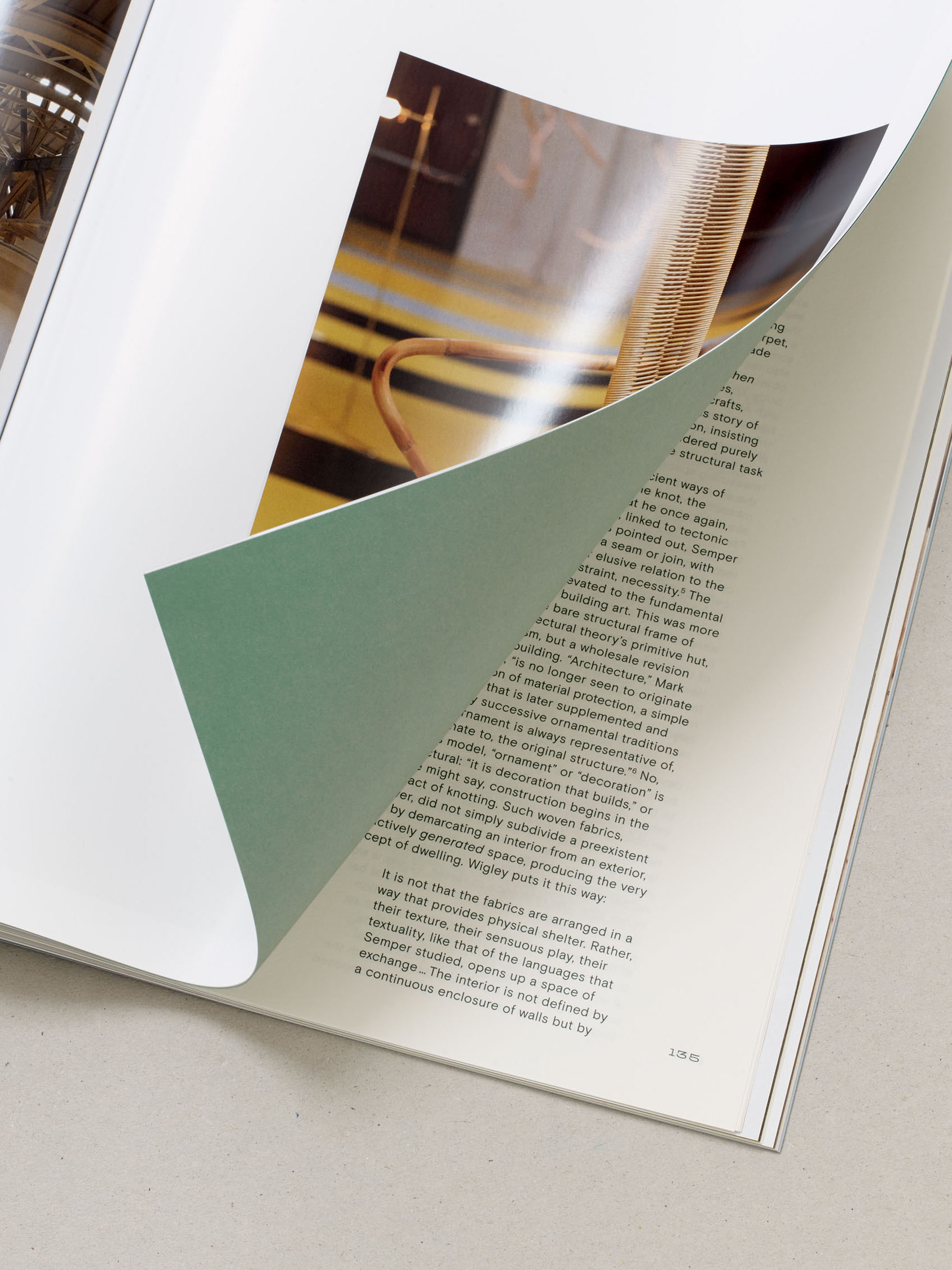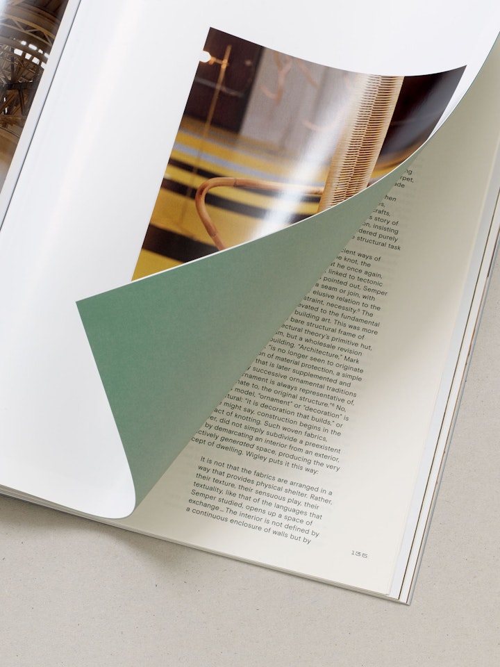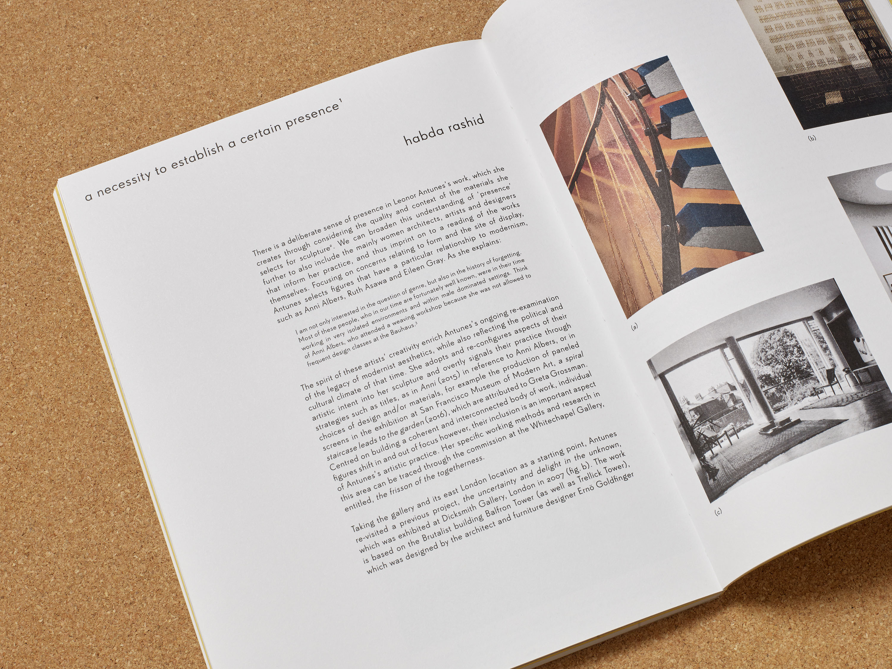 The book’s design takes inspiration from The Flat Book (1939) by Sadie Speight and Leslie Martin, architects of CAM’s historic building. Its colours, grid and format anchor the publication within the lineage of modernist design. Italic serif typography draws on archival language and references. By alternating between forward and backward slanted italics, the design points to both past and future, mirroring how the exhibition spans from the 1930s to the present day. When stacked, the layered italic glyphs form a visual weave that references Antunes’s sculptures. Inside, spliced pages echo her woven works and extend the interplay between artworks.