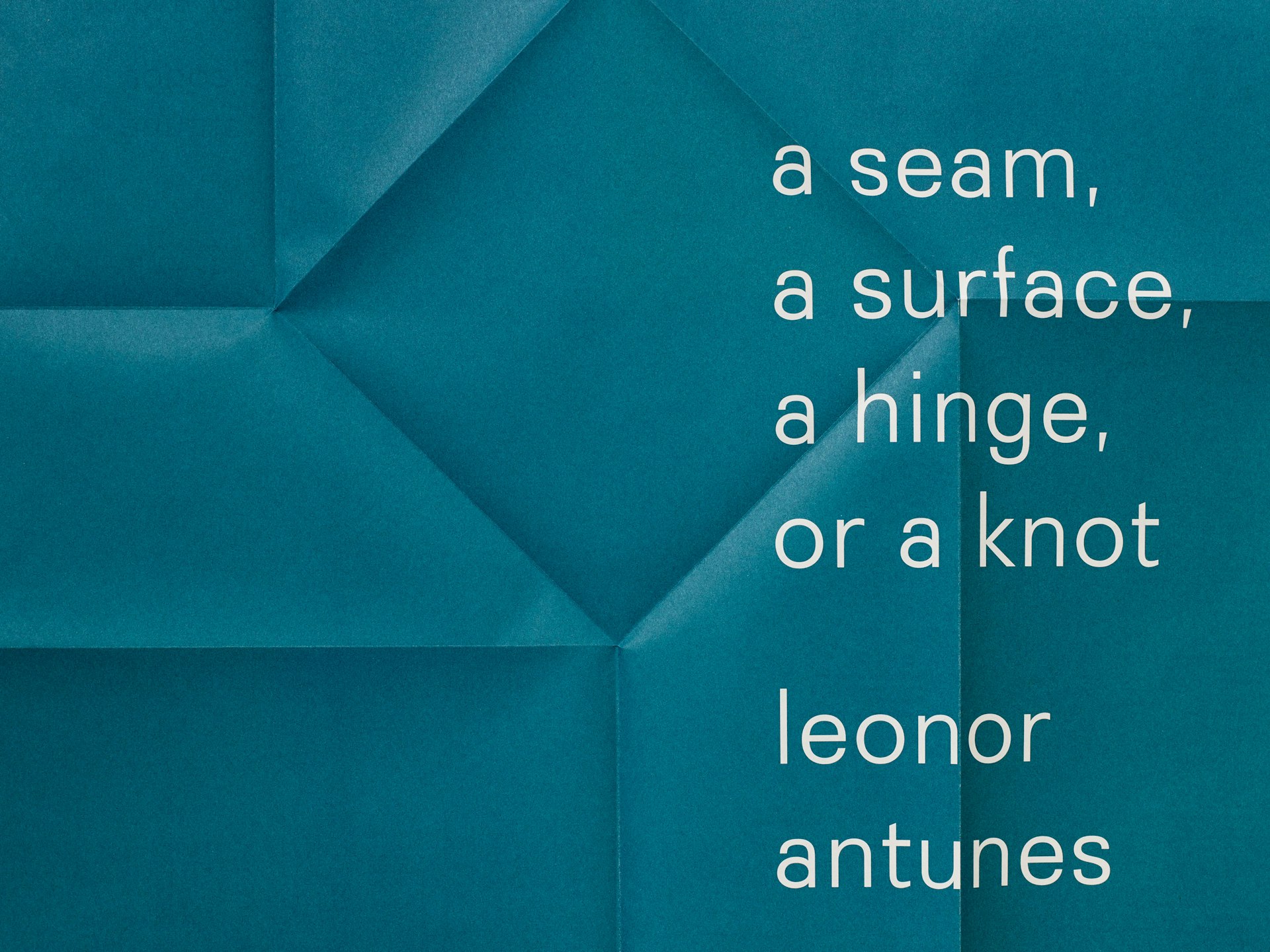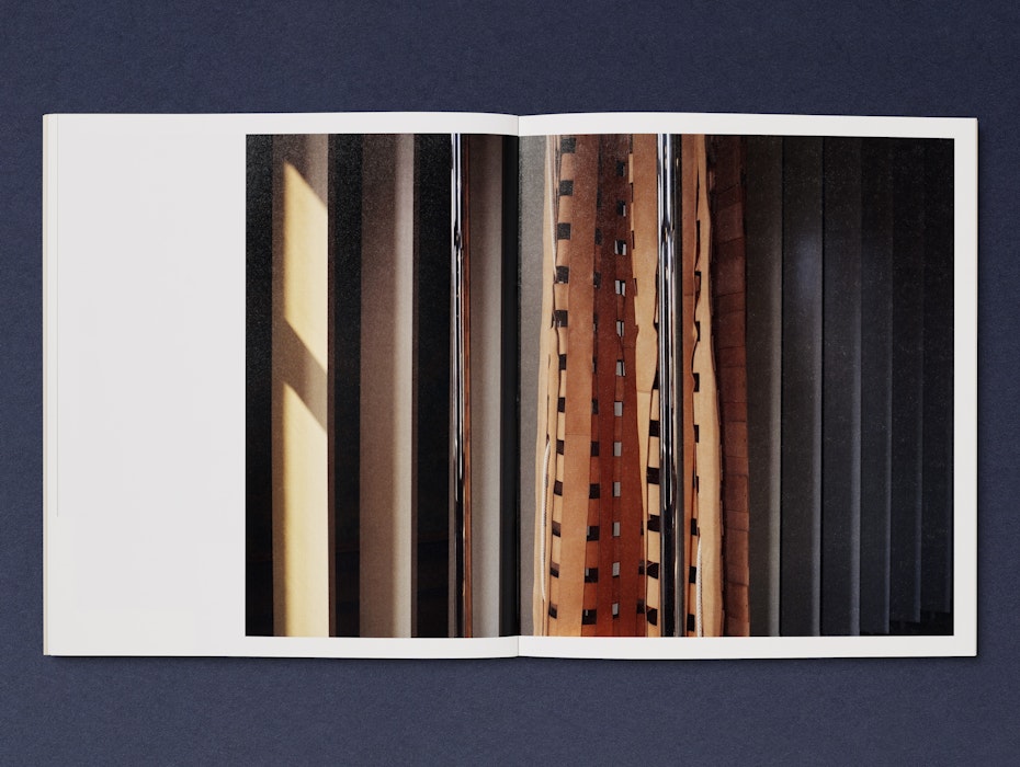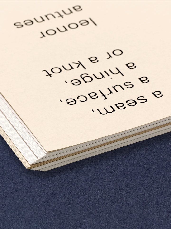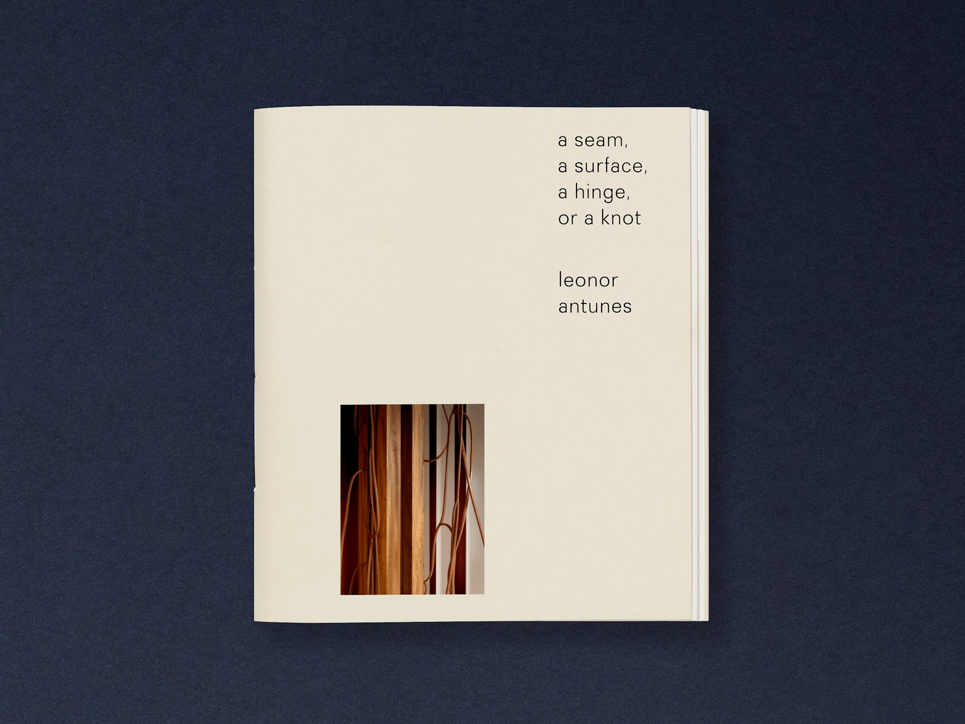 The catalogue’s form responds to the idea of a seam, surface or hinge of a book. Texts are gathered within the central pages, and the tinted papers reflect the raw leathers used in Antunes’s works. Two die-cut sheets reference cut leather and woodwork, and echo architectural apertures within the exhibition space. An accompanying booklet takes the form of a poster that folds down like a knot, drawing on ideas within Antunes’s installation.