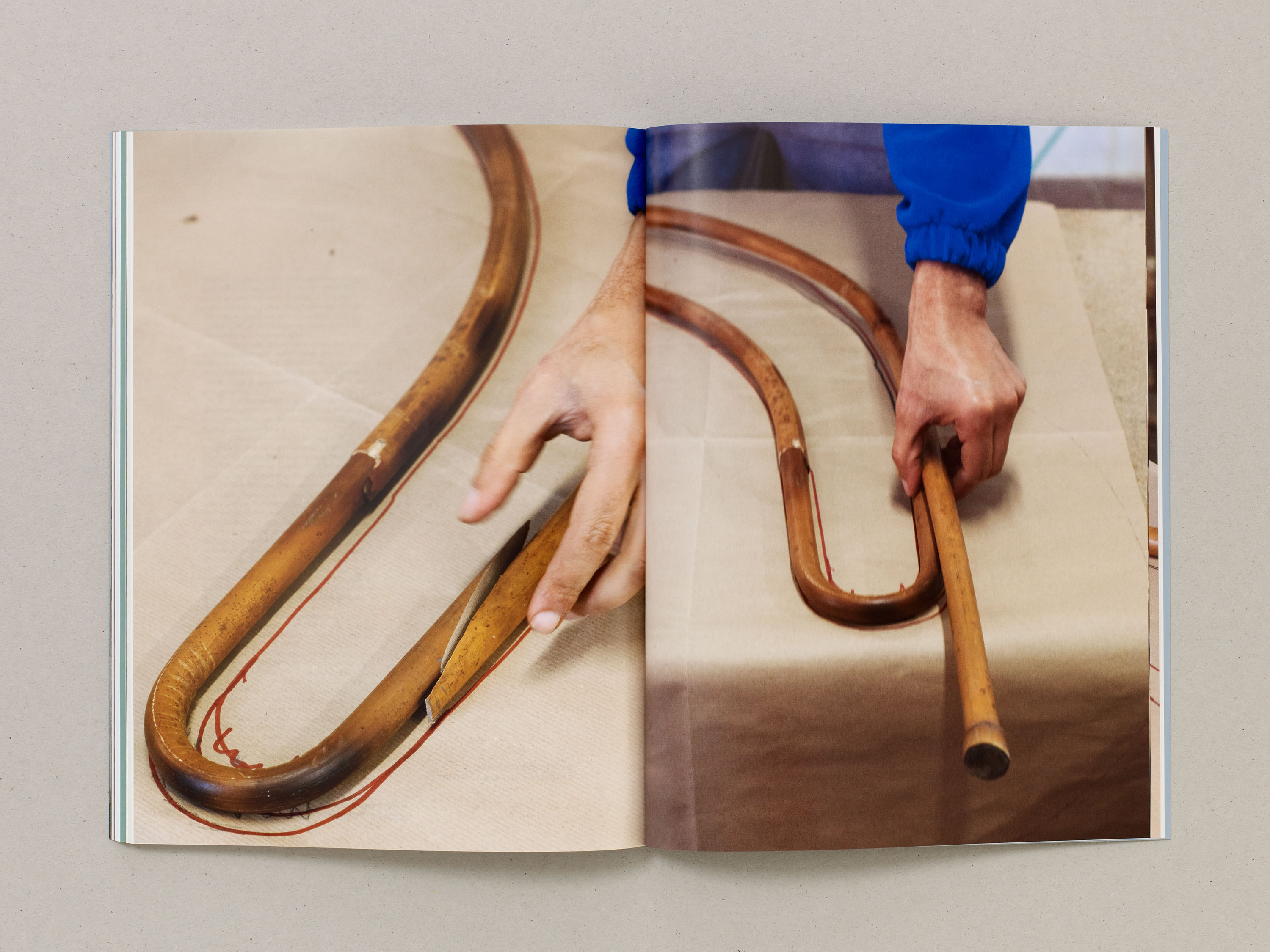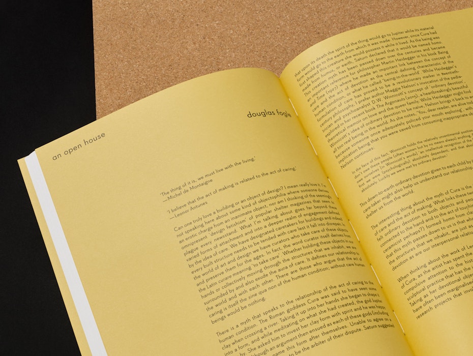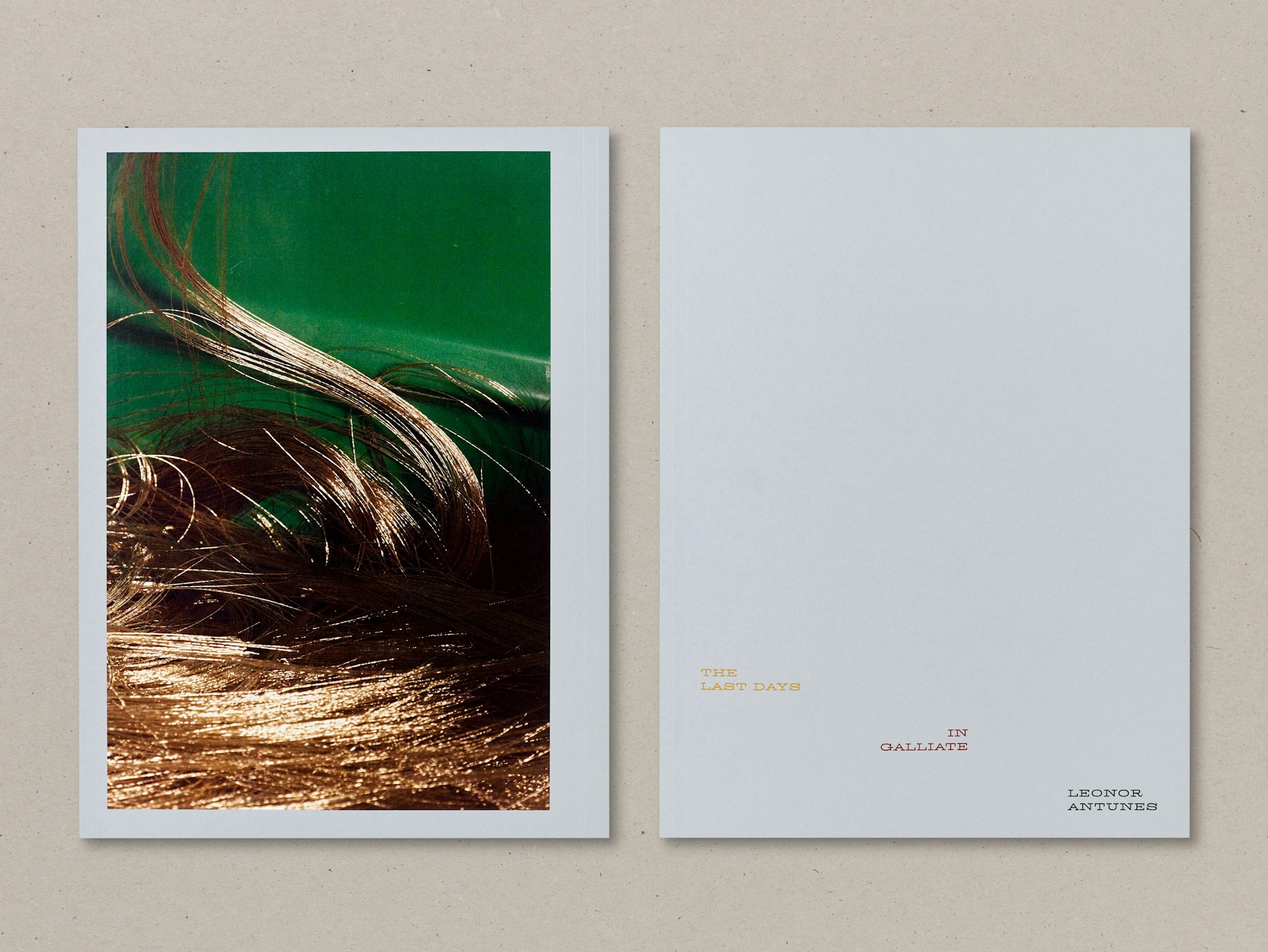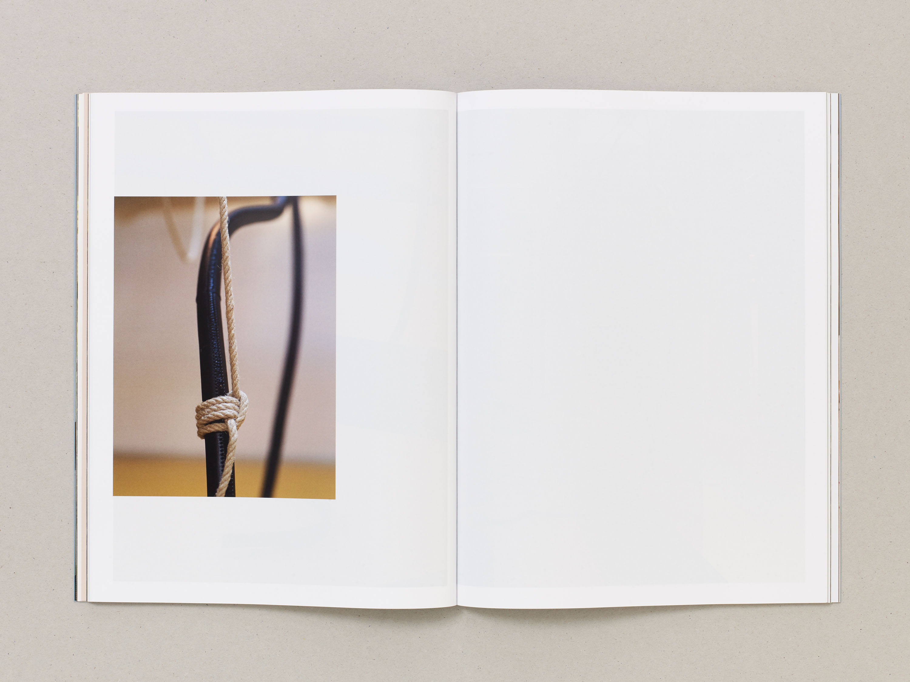 The catalogue’s form responds to the idea of a seam, surface or hinge of a book. Texts are gathered within the central pages, and the tinted papers reflect the raw leathers used in Antunes’s works. Two die-cut sheets reference cut leather and woodwork, and echo architectural apertures within the exhibition space. An accompanying booklet takes the form of a poster that folds down like a knot, drawing on ideas within Antunes’s installation.