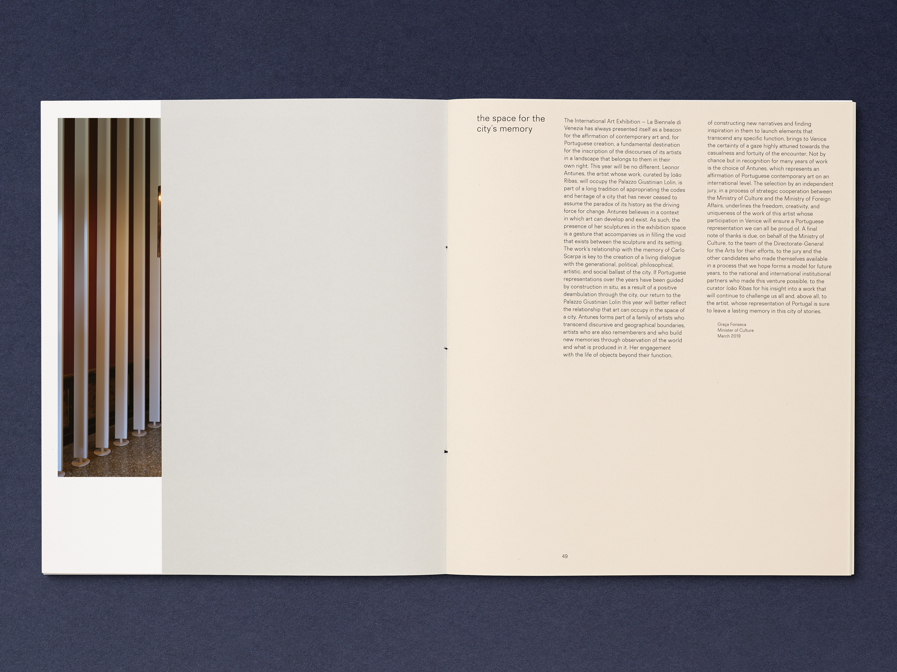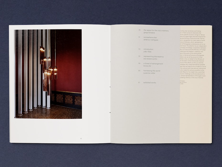 We developed the graphic identity for the Pavilion of Portugal at the 58th International Art Exhibition – La Biennale di Venezia in 2019, for which Antunes created an installation shaped by extensive research into key figures in Venice’s cultural history. Working with traditional makers from the region, Antunes brought these histories together in an installation incorporating craftsmanship from Italy, Japan and Portugal.