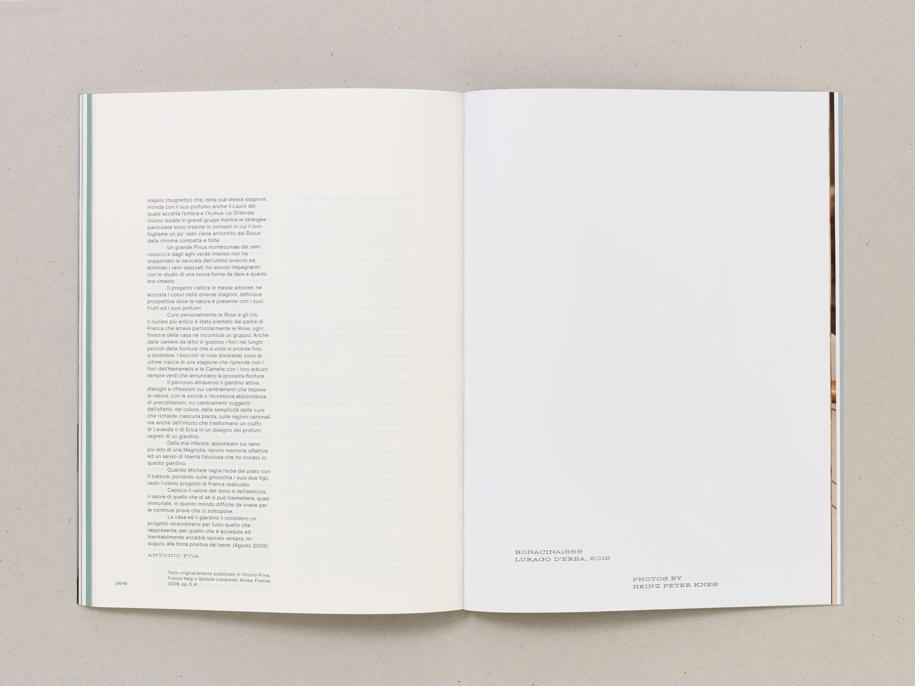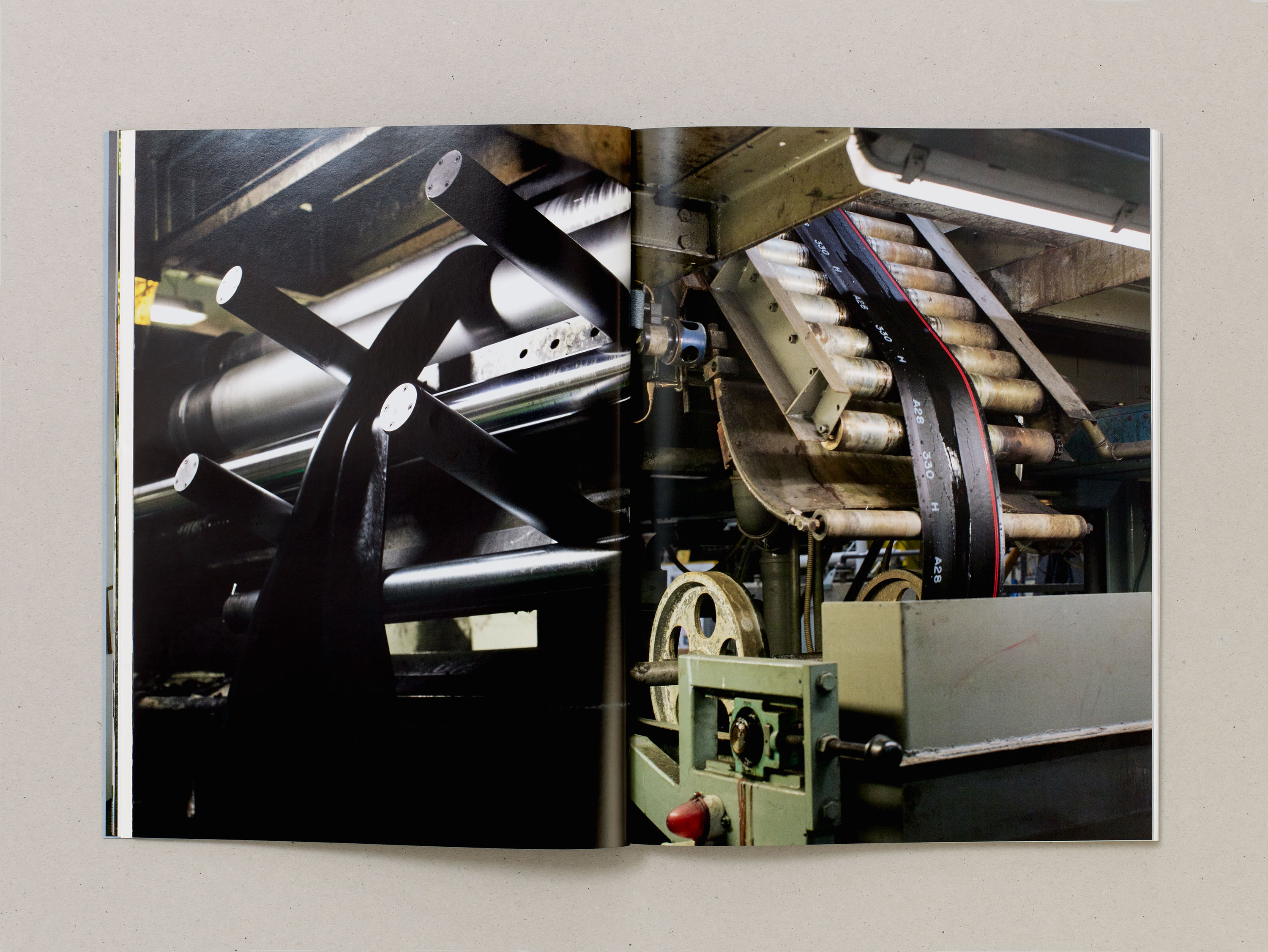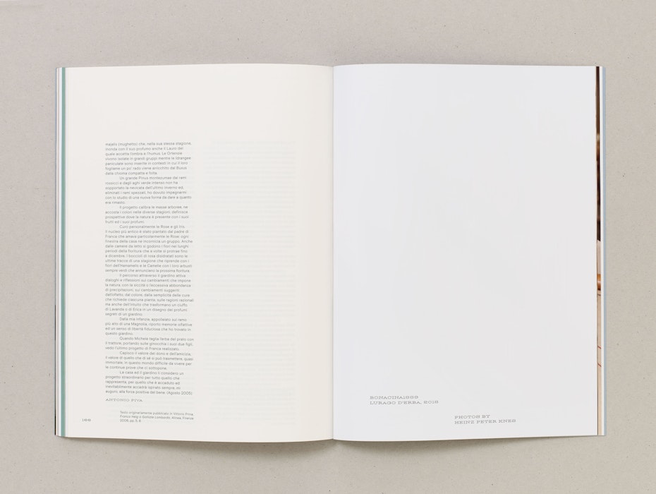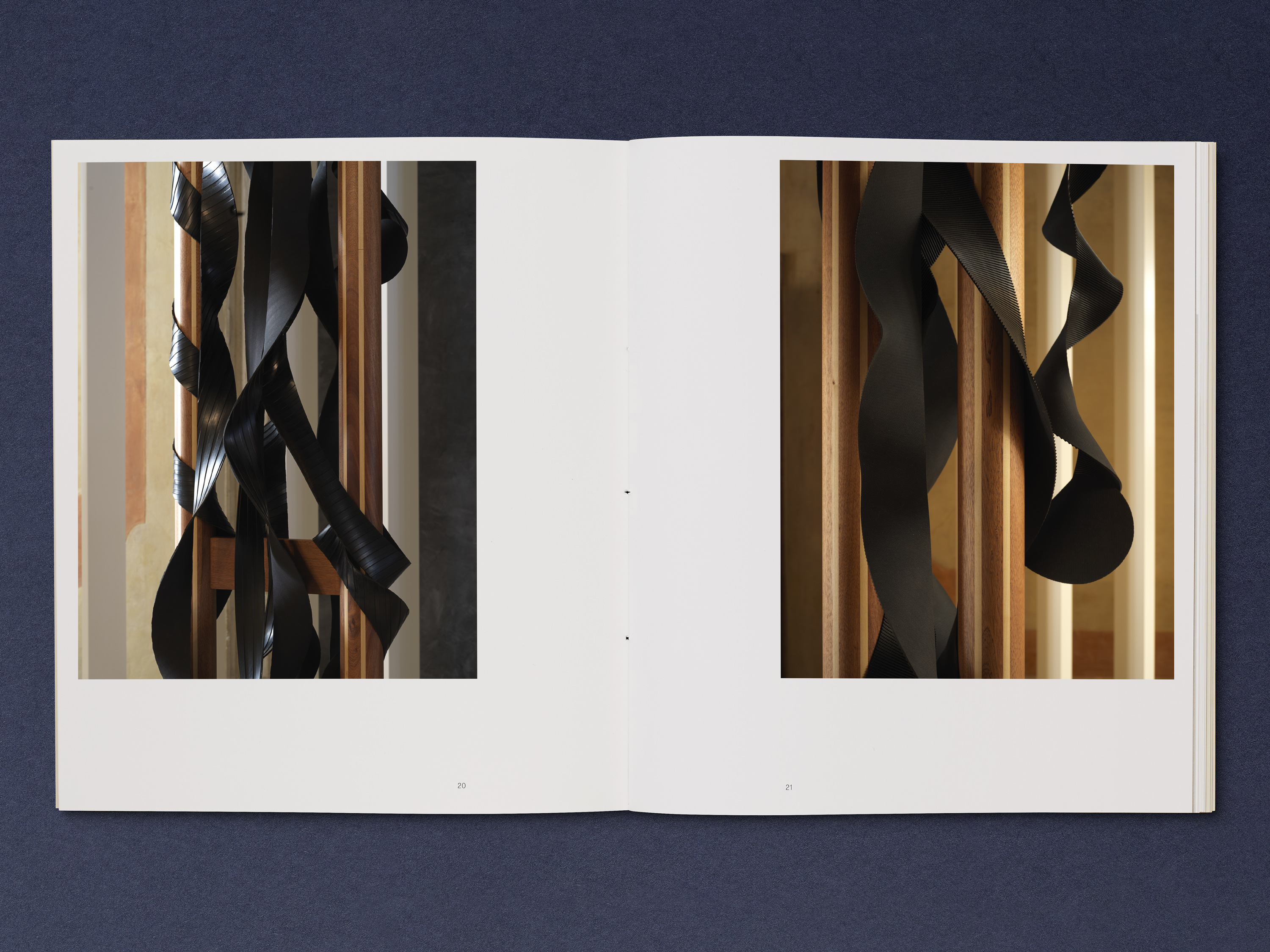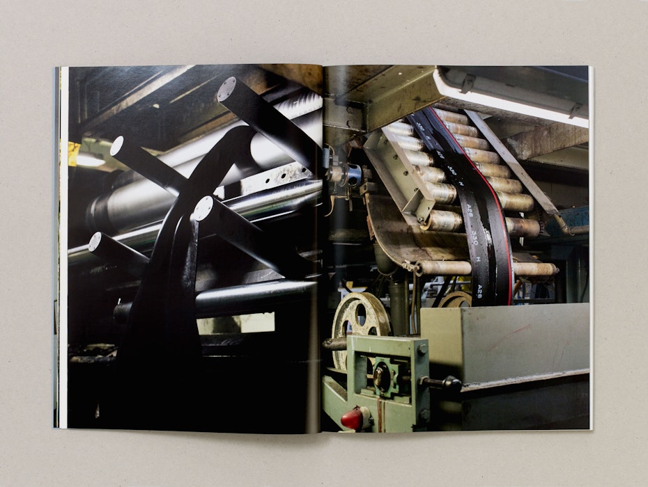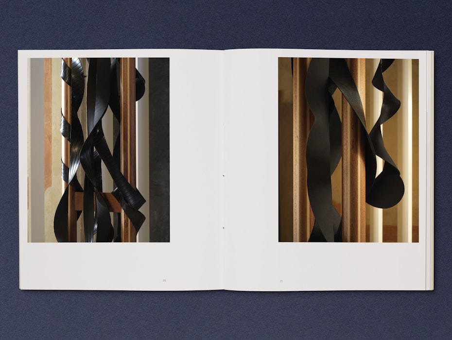 Inside, Antunes’ research is given equal prominence with documentation of the exhibition. Alongside installation images of her finished works, photography by Heinz Peter Knes is featured throughout. Taken at Galliate Lombardo, Settimo Torinese and Lurago d’Erba, these images offer atmospheric insights into the research and material development of the installation.