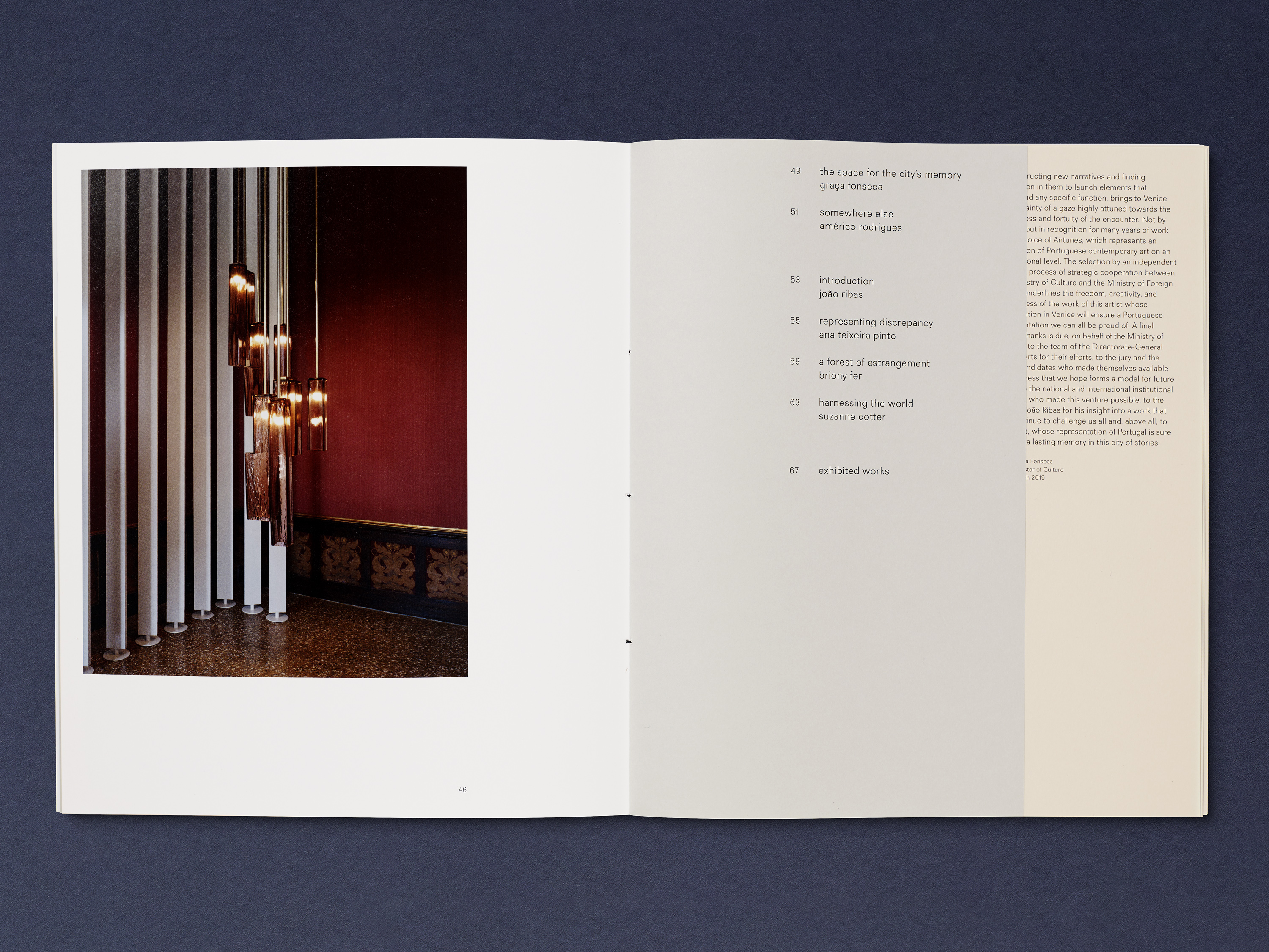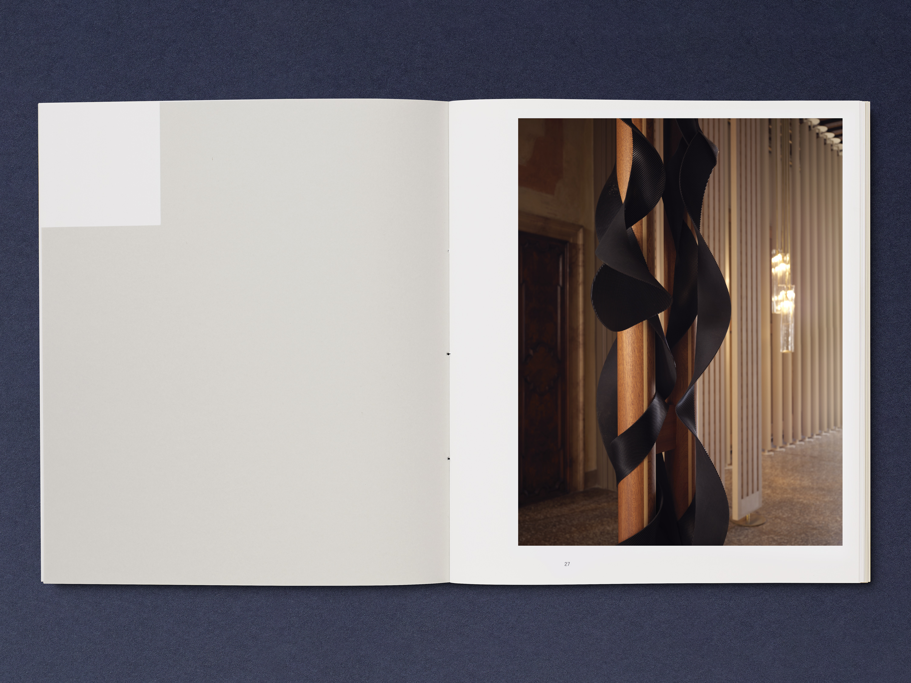Our approach drew upon cultural and historical details specific to the context of Antunes’s installation at Palazzo Giustinian Lolin in Venice. Across the scheme, text is typeset in Recta – chosen for its relationship to the same period of Italian history that Antunes was referring to in her work.