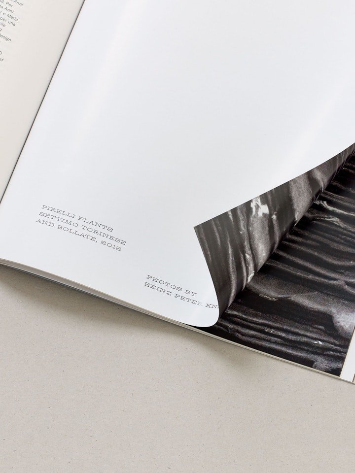 The publication’s format draws on early issues of Pirelli magazine, with typographic layouts inspired by an edition from the early 1950s. Sections of glossy paper and inserts, in colours informed by Antunes’s work, further reinforce this connection.