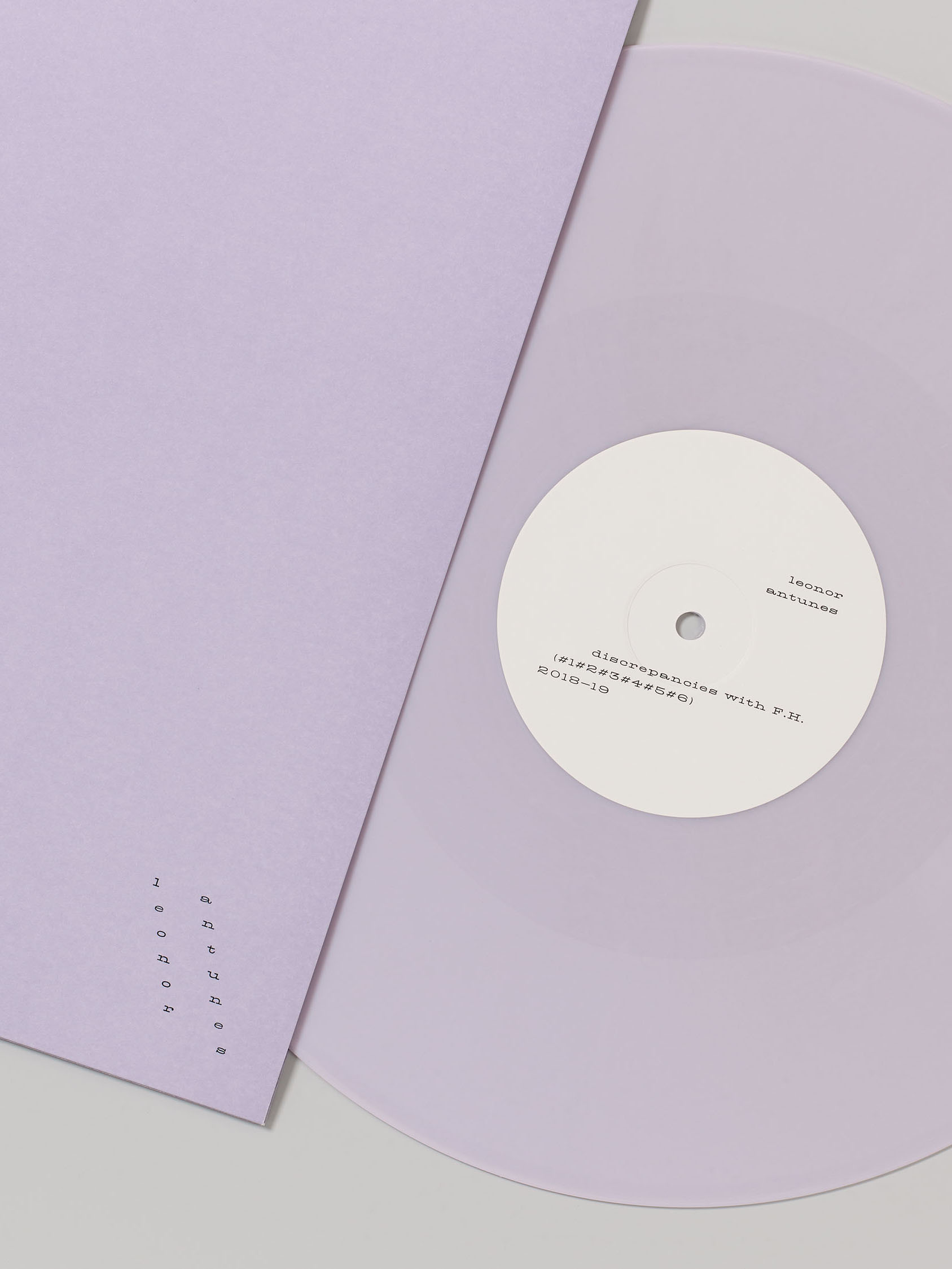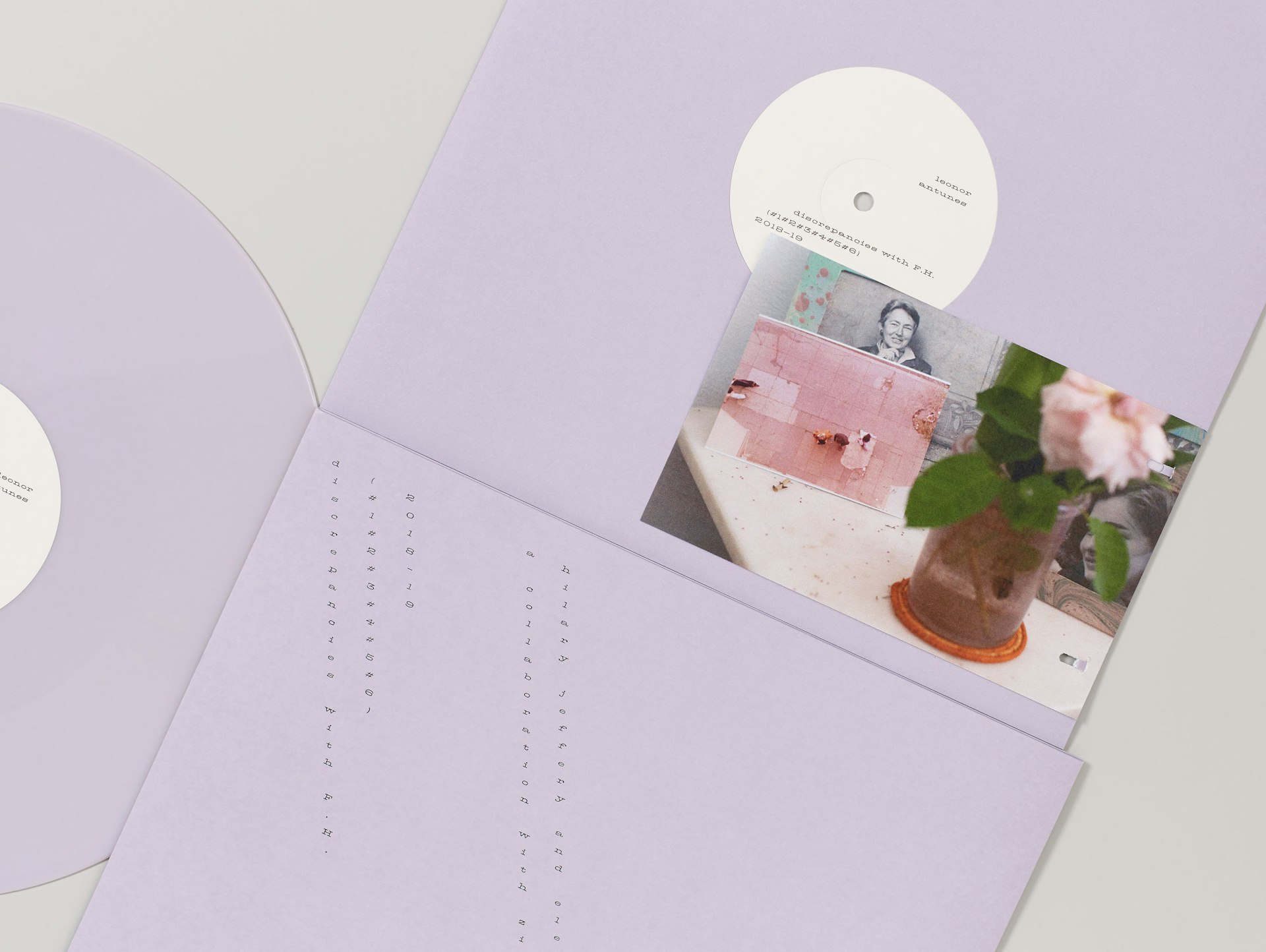 The lavender colour, which is consistent across the sleeve, the inner case and the pressed vinyl itself, is derived from a tone within the musical composition. The use of white space and asymmetrical typography on the cover responds to the composition of the artworks themselves. A portrait of Italian architect Franca Helg by Heinz Peter Knes is attached to the sleeve with a paper staple. The handwritten note from Antunes inside includes a small edition number, emphasising the materiality of the edition.