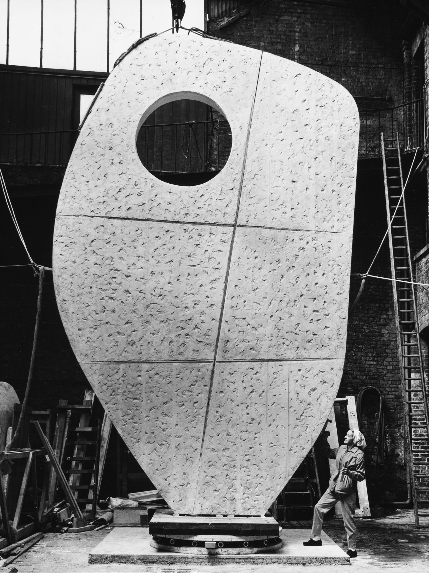 Barbara Hepworth with the plaster Single Form at the Morris Singer Foundry, May 1963. Photograph by Morgan-Wells.