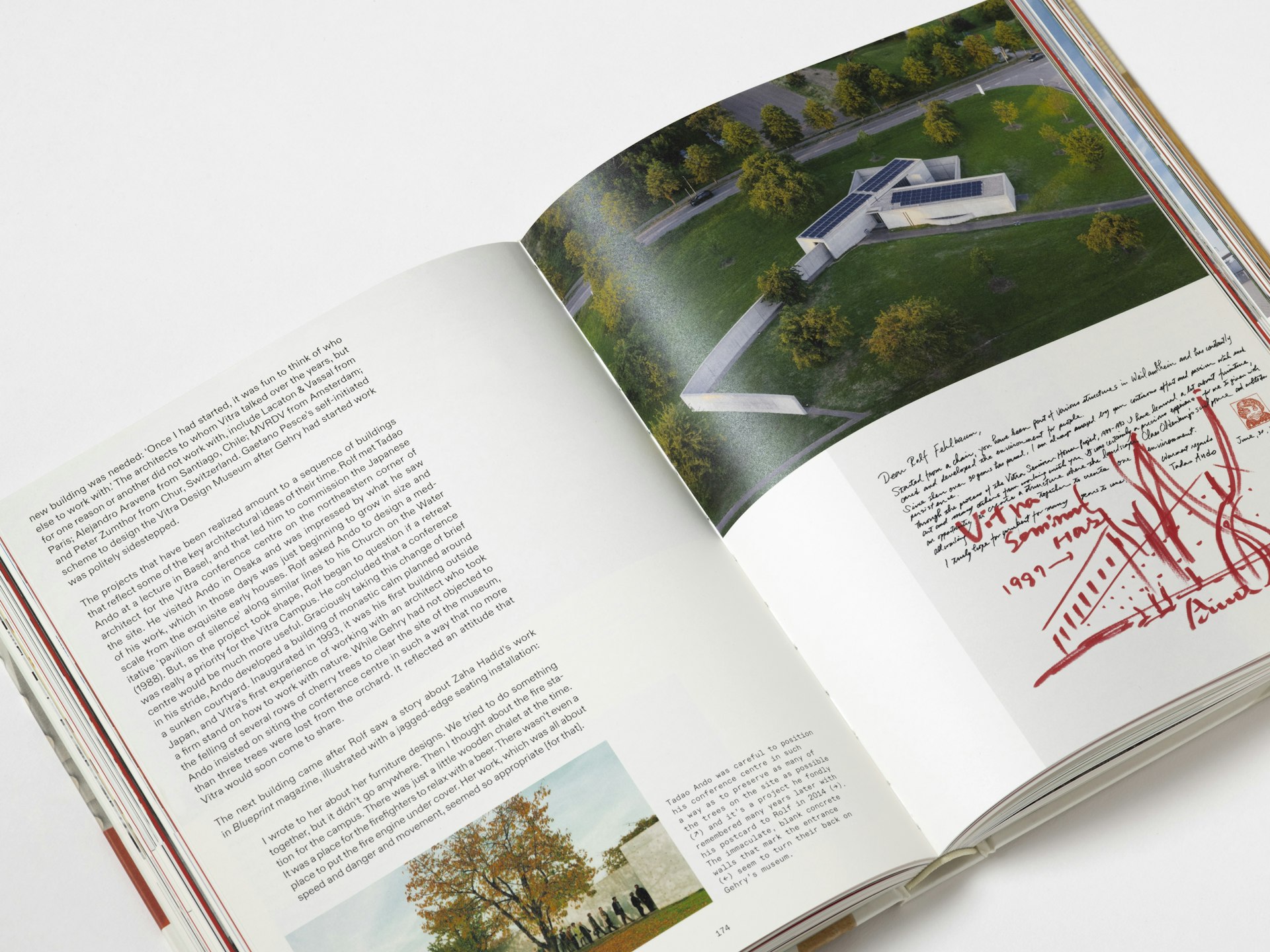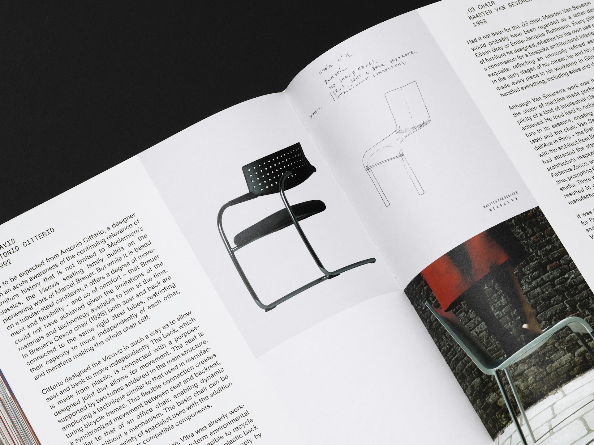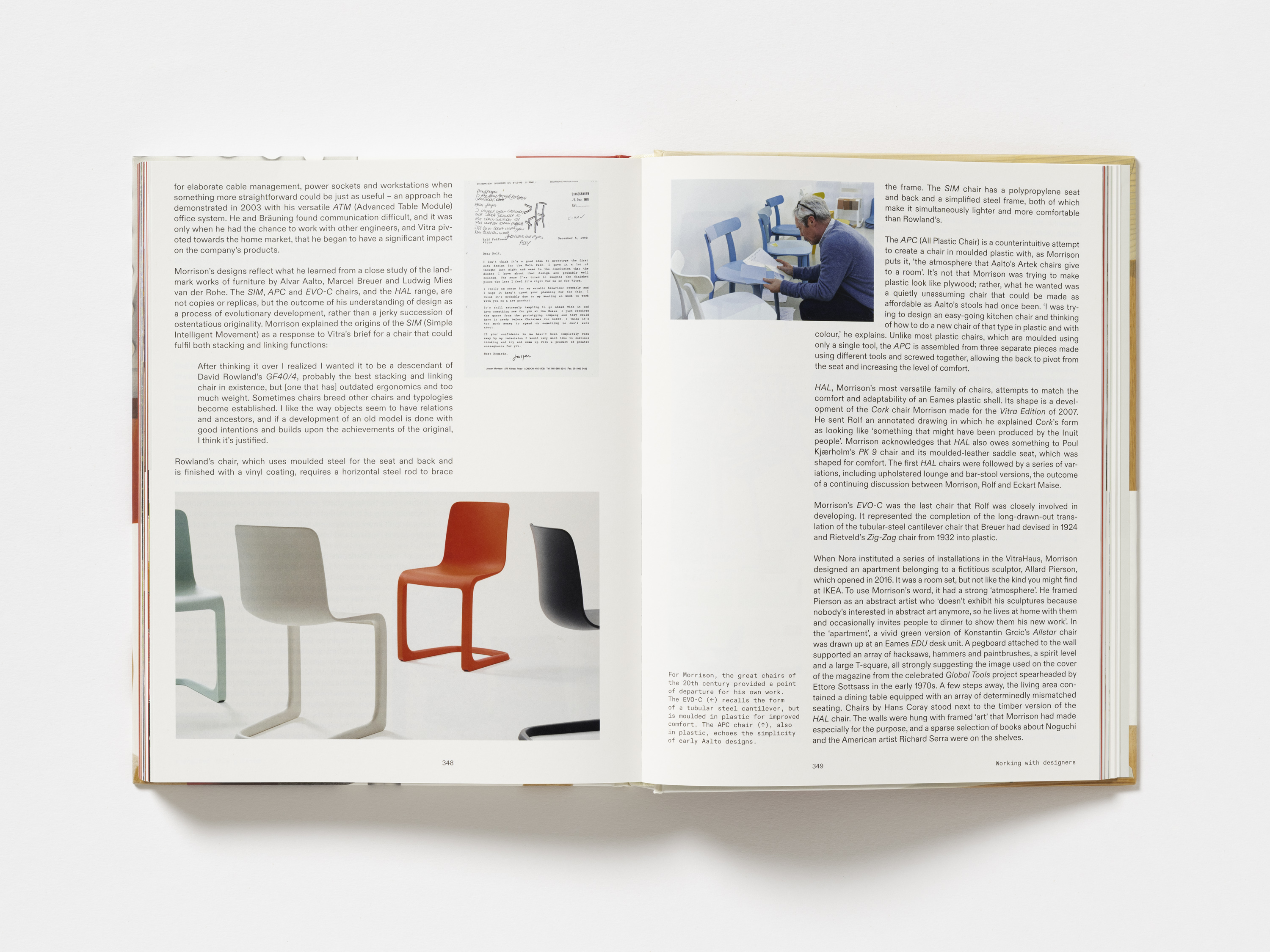 The cover features details of key products from Vitra’s history, highlighting the inventive production techniques pioneered by the company. The red of the Evo-C chair by Jasper Morrison is matched precisely to the chair itself, while the embossed Vitra logo on the spine echoes the mark found on the products. Chapter openers feature silhouettes of products and architectural elements, further emphasising the breadth of Vitra’s work.