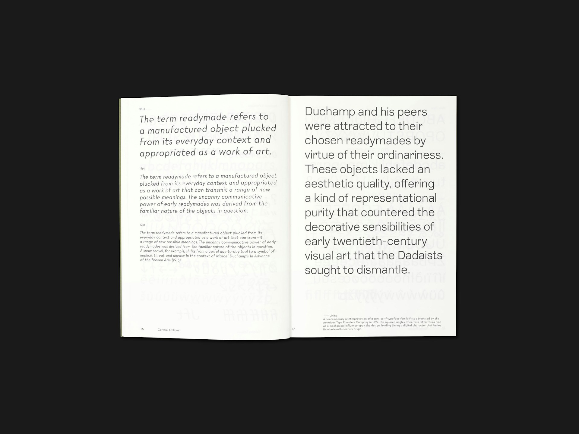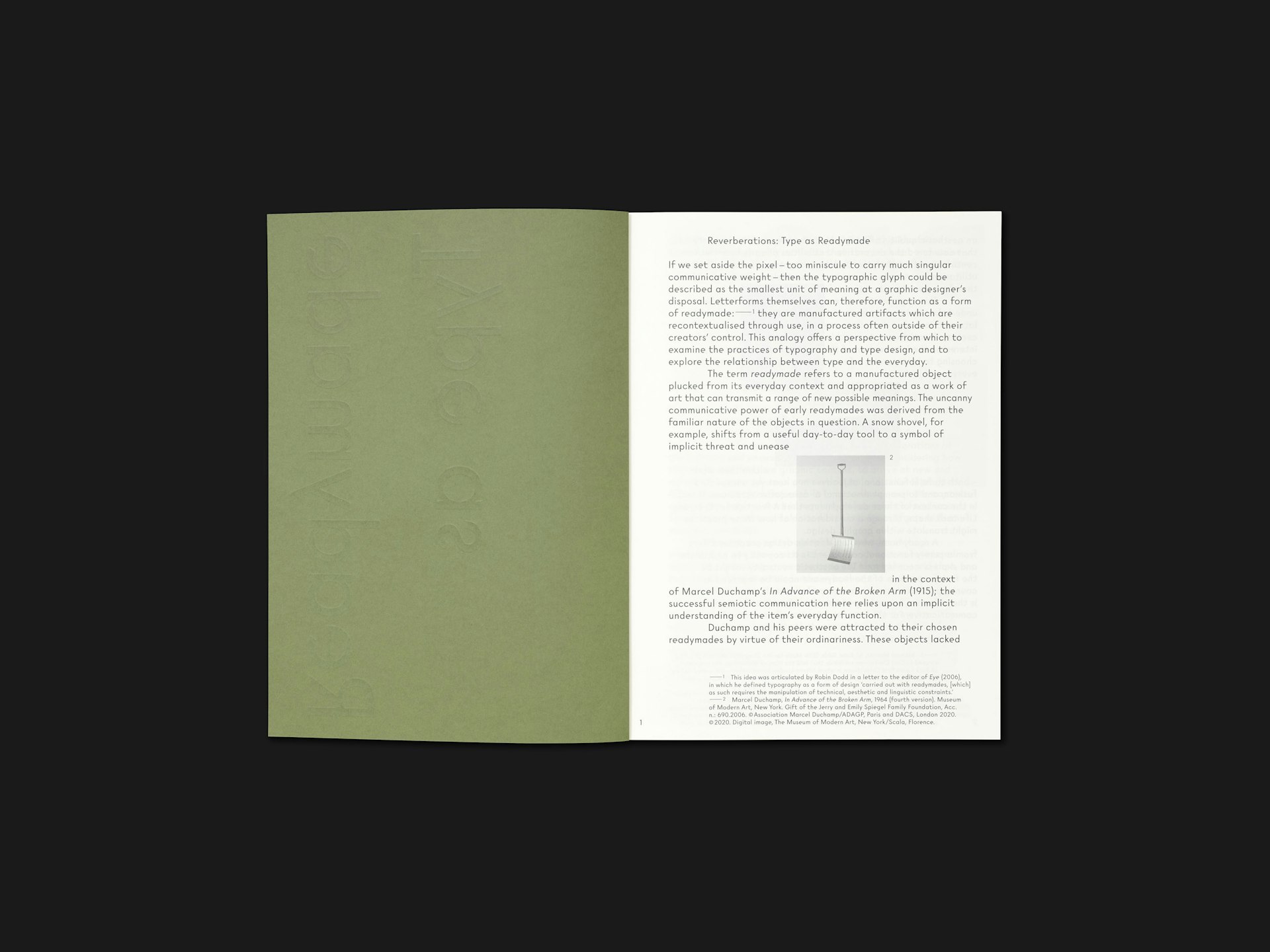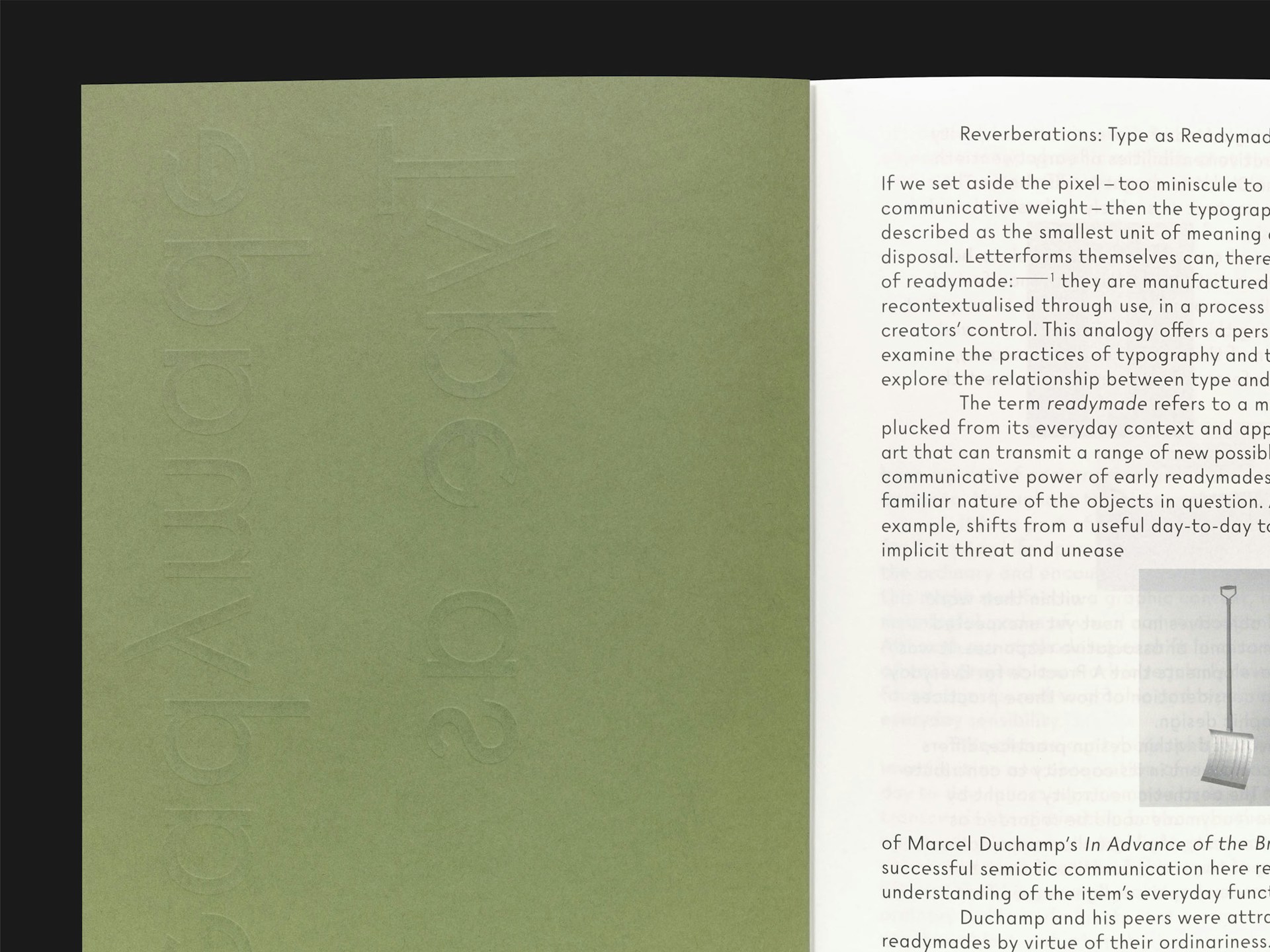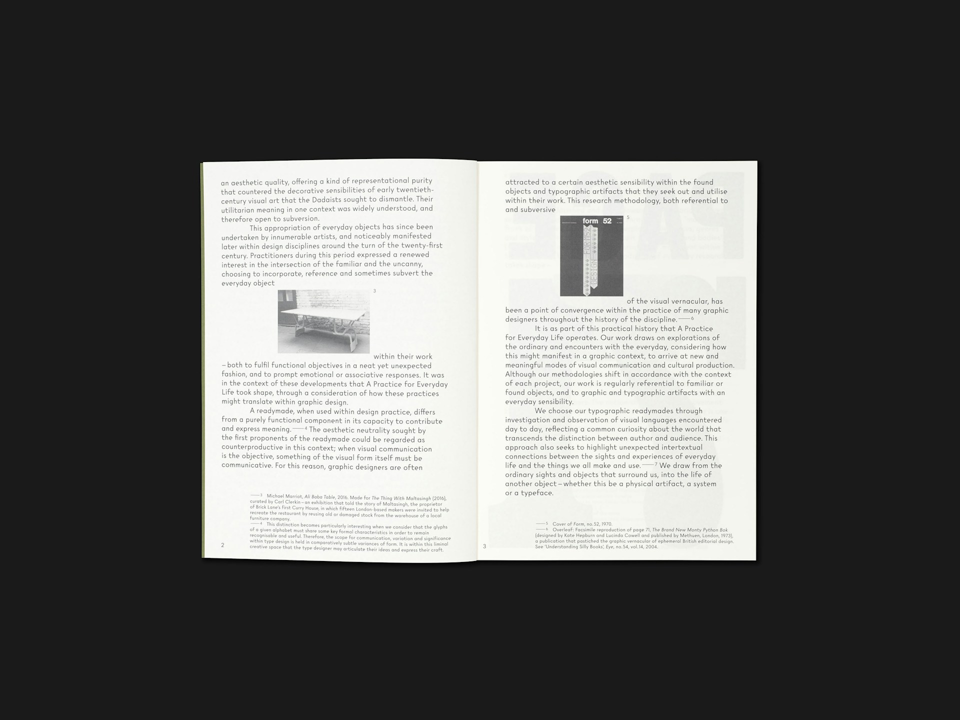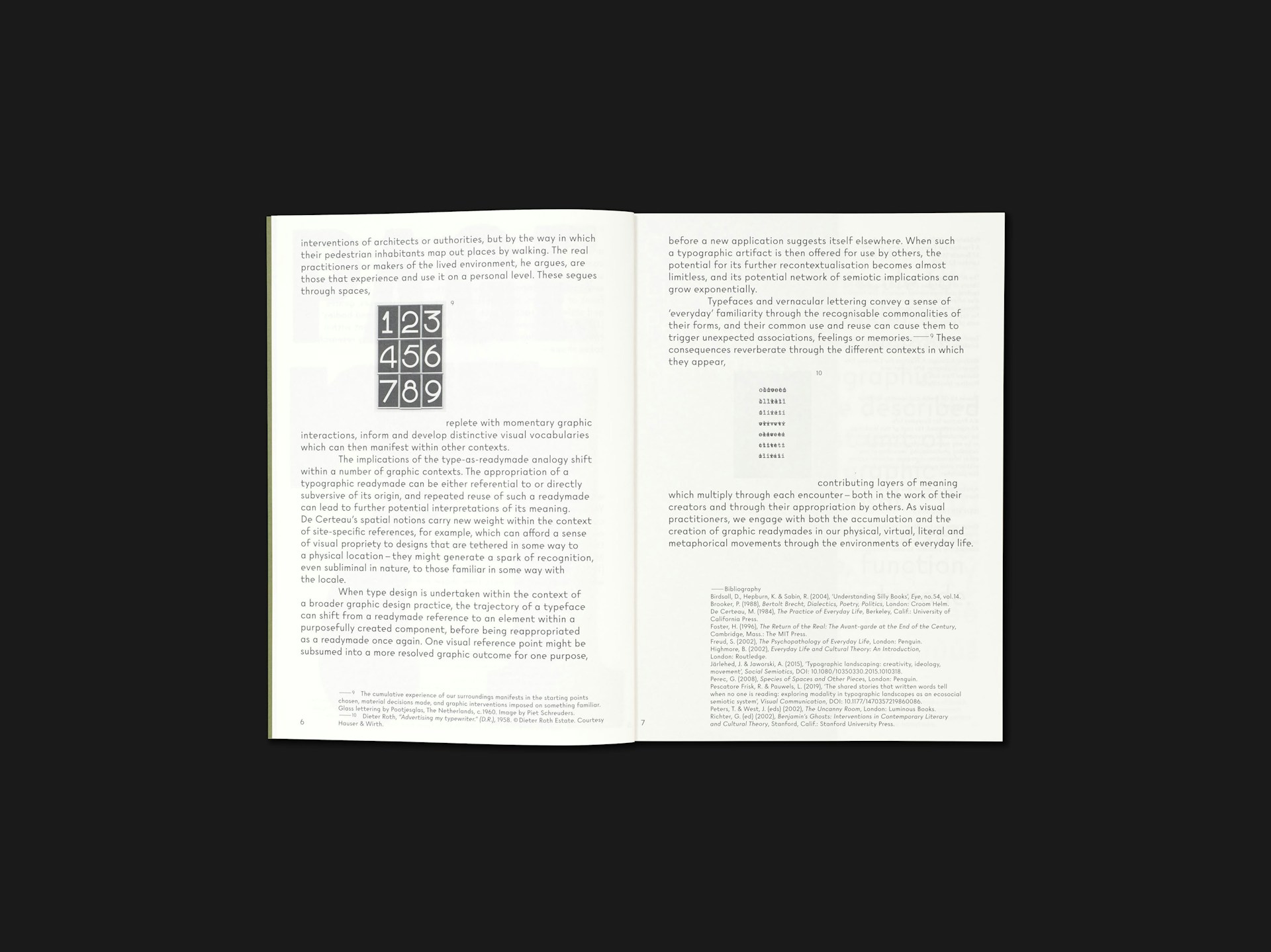 This publication explores type as a form of readymade. It looks at the relationship between research, visual reference, the cultural concept of the everyday and type design in context.