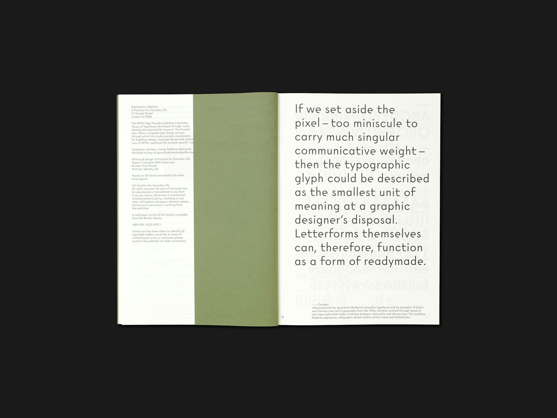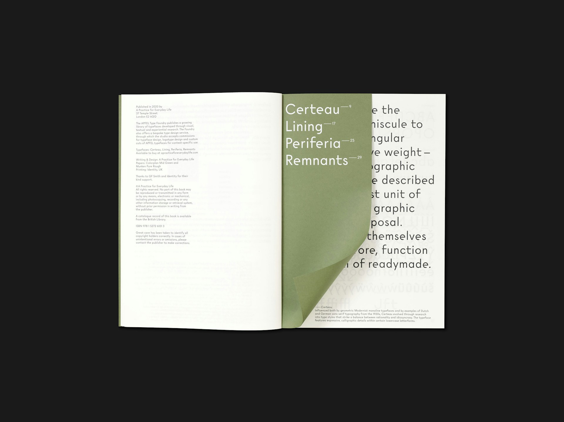 First published to coincide with the launch of APFEL Type in 2020, it also functions as a specimen for four retail typefaces: Certeau, Lining, Periferia and Remnants.