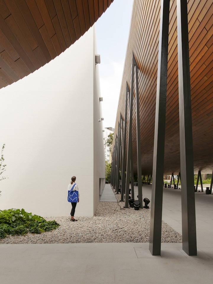 The letter A within the CAM logotype echoes the curved, canopy-like forms of the new building. The architecture is inspired by the concept of 'engawa', a principle common in Japanese buildings that connects interior and exterior spaces. This idea captures the connection between the museum and its gardens, and between the institution and the wider city.