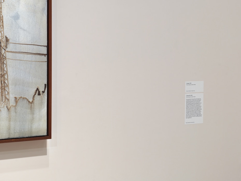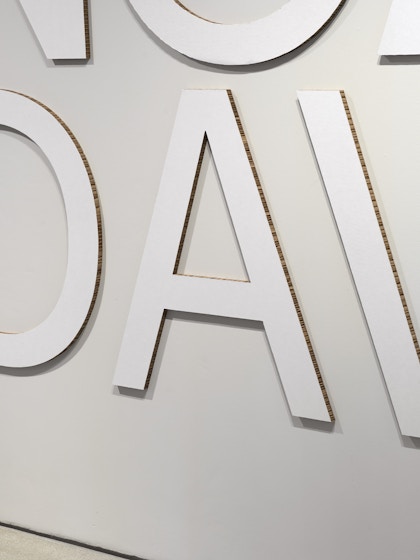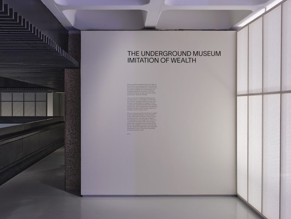 The entrance title, constructed from large, cut letters of white-faced cardboard repurposed from recycled boxes, nods to the DIY ethos of the Underground Museum. Exhibition texts are screen-printed directly onto the walls, lending a tactile quality that echoes the human touch behind Davis’s work.