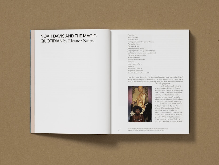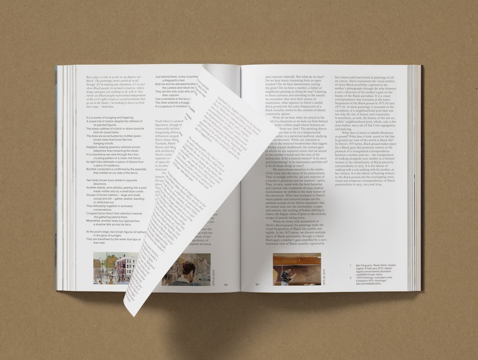 These contrast with the more structured layout of the plate sections, which combine painting and works on paper with sculpture. The sequencing reflects Davis’s practice: deeply engaged with art history yet determined to challenge its limits and expand its perspectives. The interplay between reverence and disruption is also echoed in the book’s typography, which juxtaposes a blocky, contemporary sans serif with a more traditional serif.