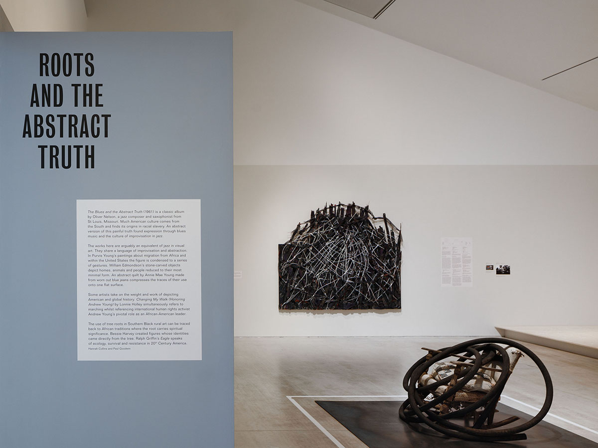 We developed a quiet and delicate approach to the exhibition design. The contemporary and legible nature of the interpretation texts and captions, set in the typeface McQueen Grotesk, is offset by the use of prominent paragraph indentation and the subtly exaggerated details of certain letterforms. The colour palette of muted purple and deep grey are taken from the richer tones within Armitage’s paintings, chosen to subtly complement each other across the exhibition graphics and printed gallery guide.