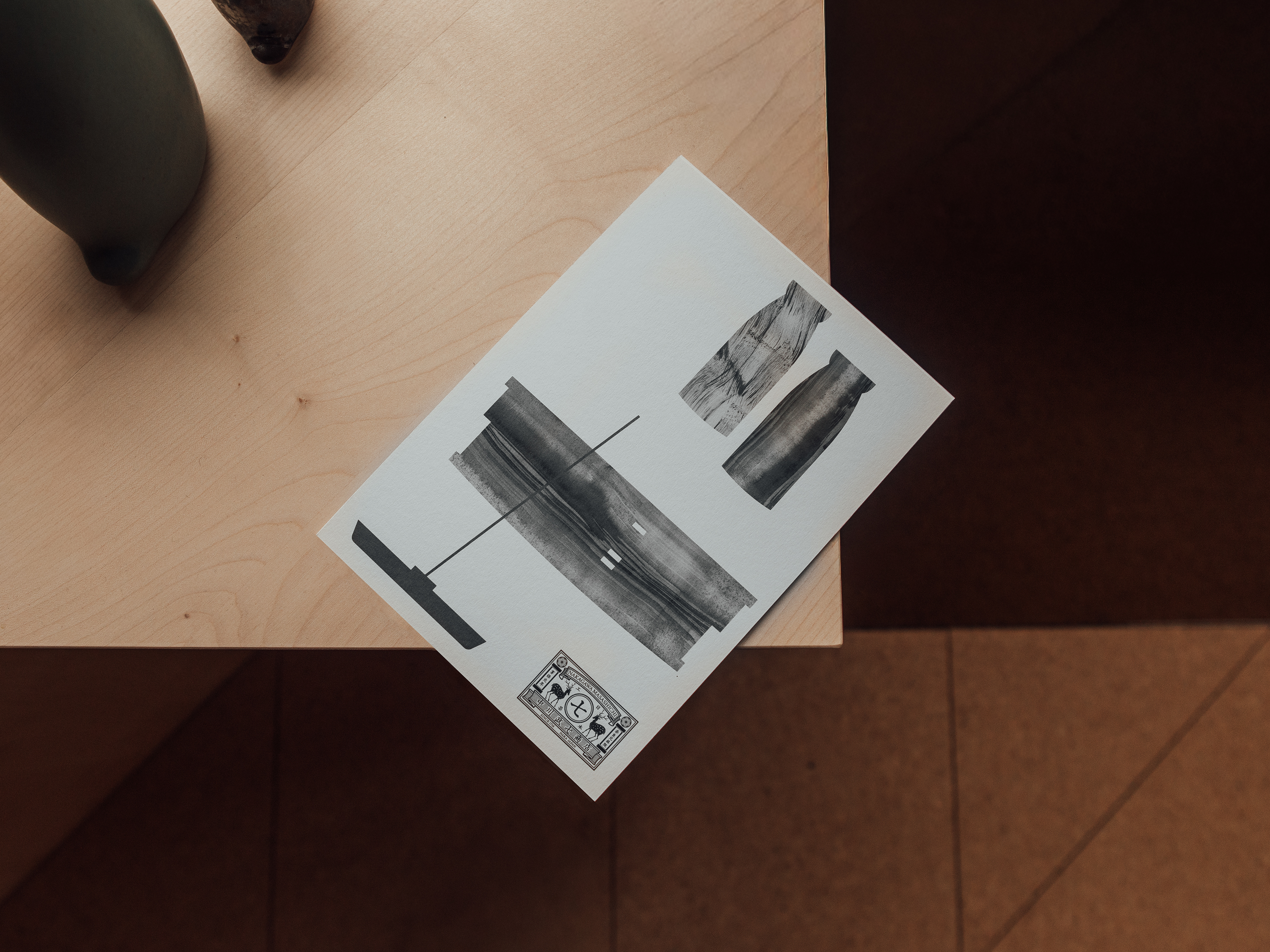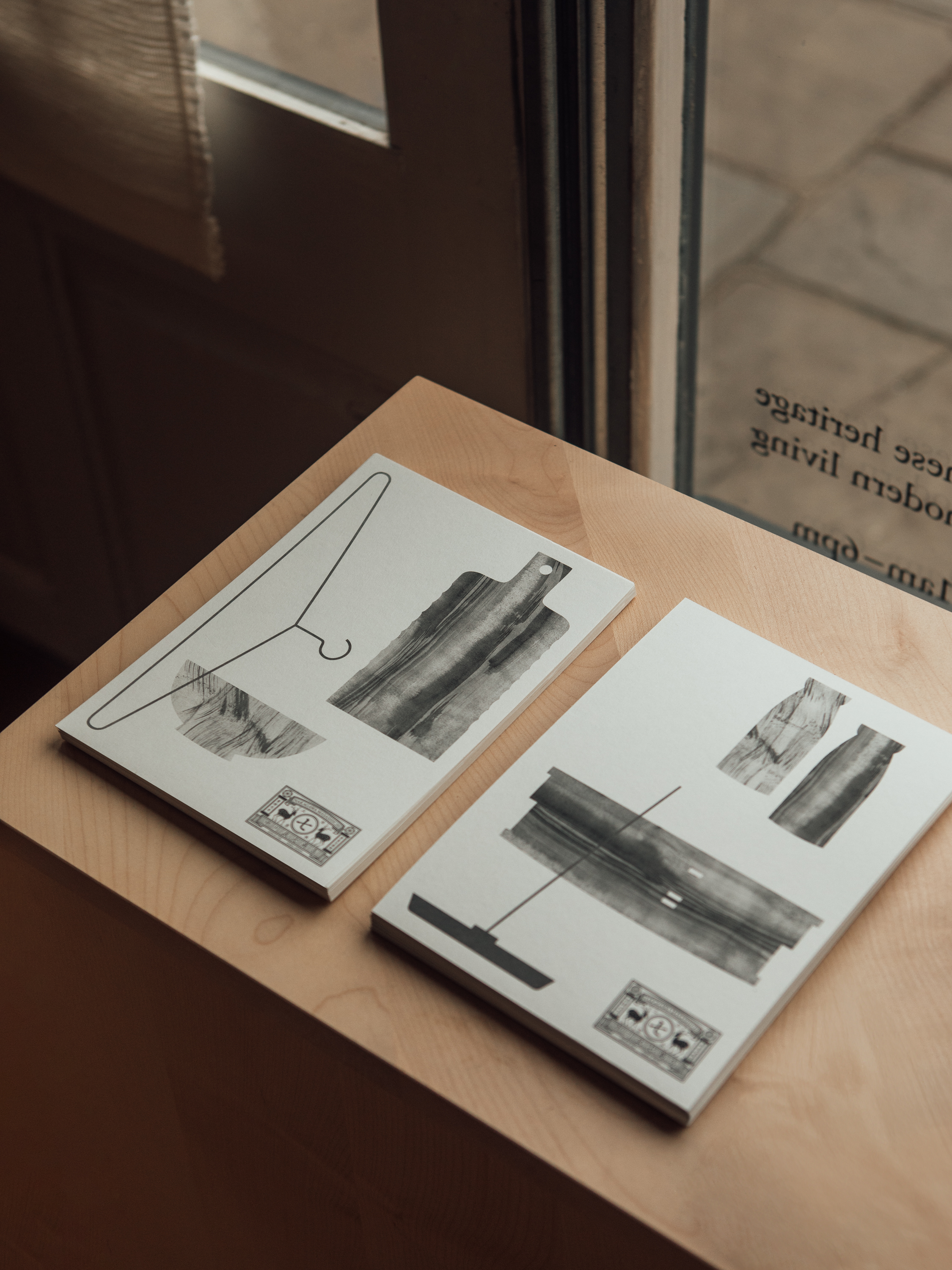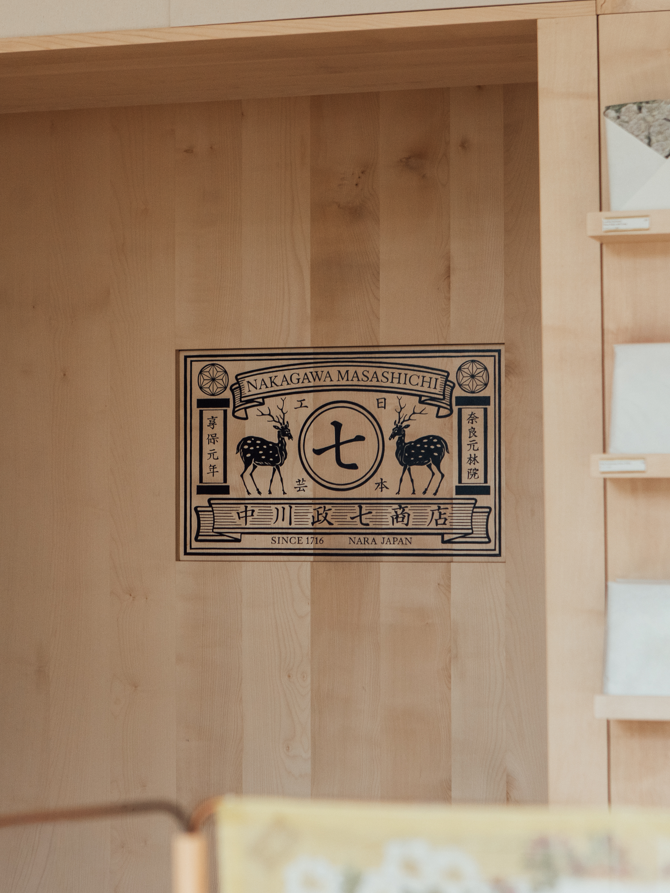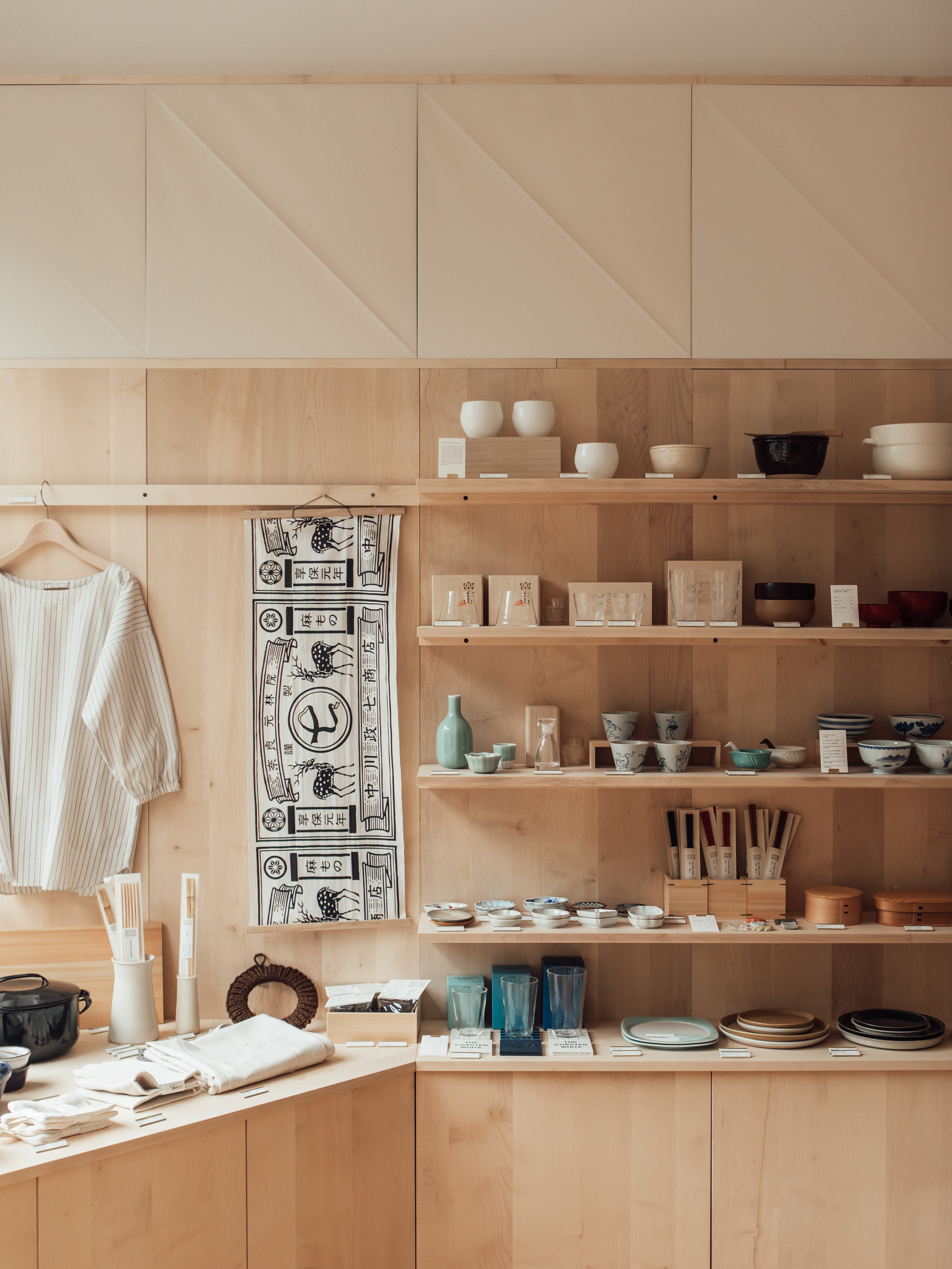 The interior design, made from British sycamore and linen book-cloth, takes inspiration from the geometric forms featured in Nakagawa’s products and packaging. Graphics are quietly integrated throughout, with text hand-painted onto glass and wood, allowing the objects to take focus.