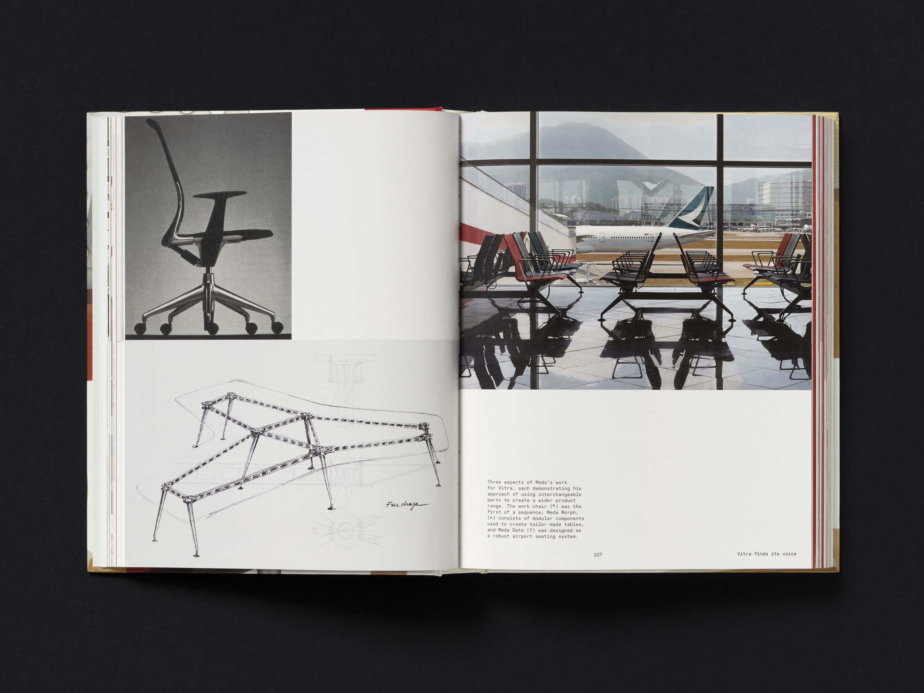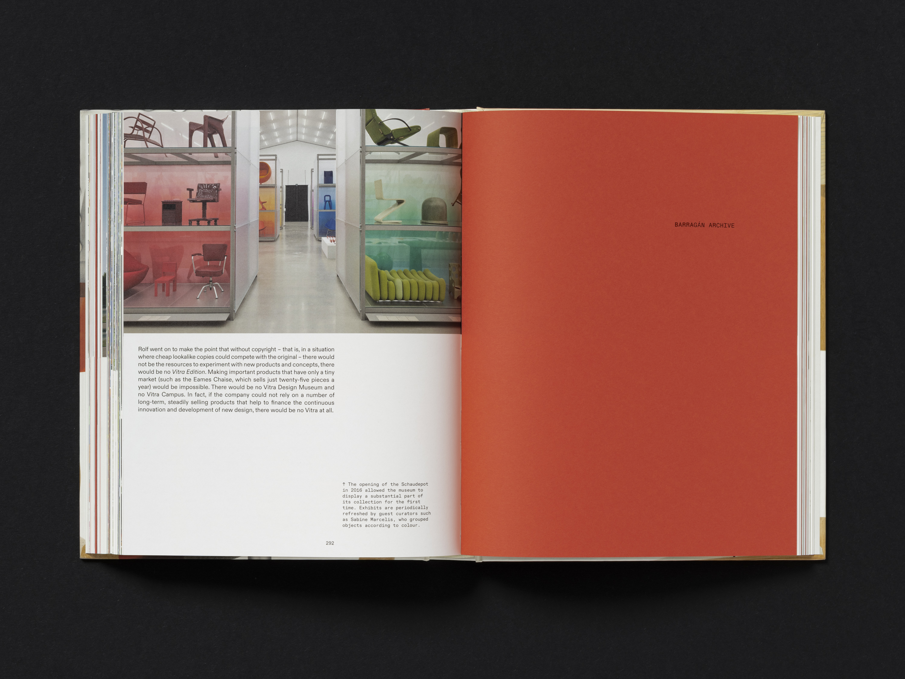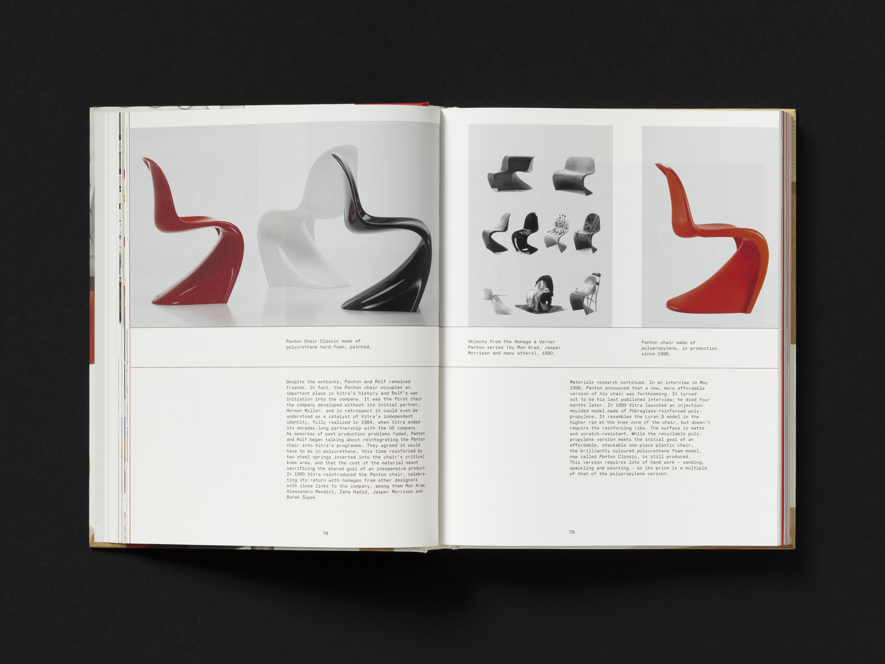 The cover features details of key products from Vitra’s history, highlighting the inventive production techniques pioneered by the company. The red of the Evo-C chair (by Jasper Morrison, 2020) is matched precisely to the chair itself, while the embossed Vitra logo echoes the mark found on their products. Chapter openers also feature silhouettes of products and architectural elements, further emphasising the breadth of Vitra’s work.