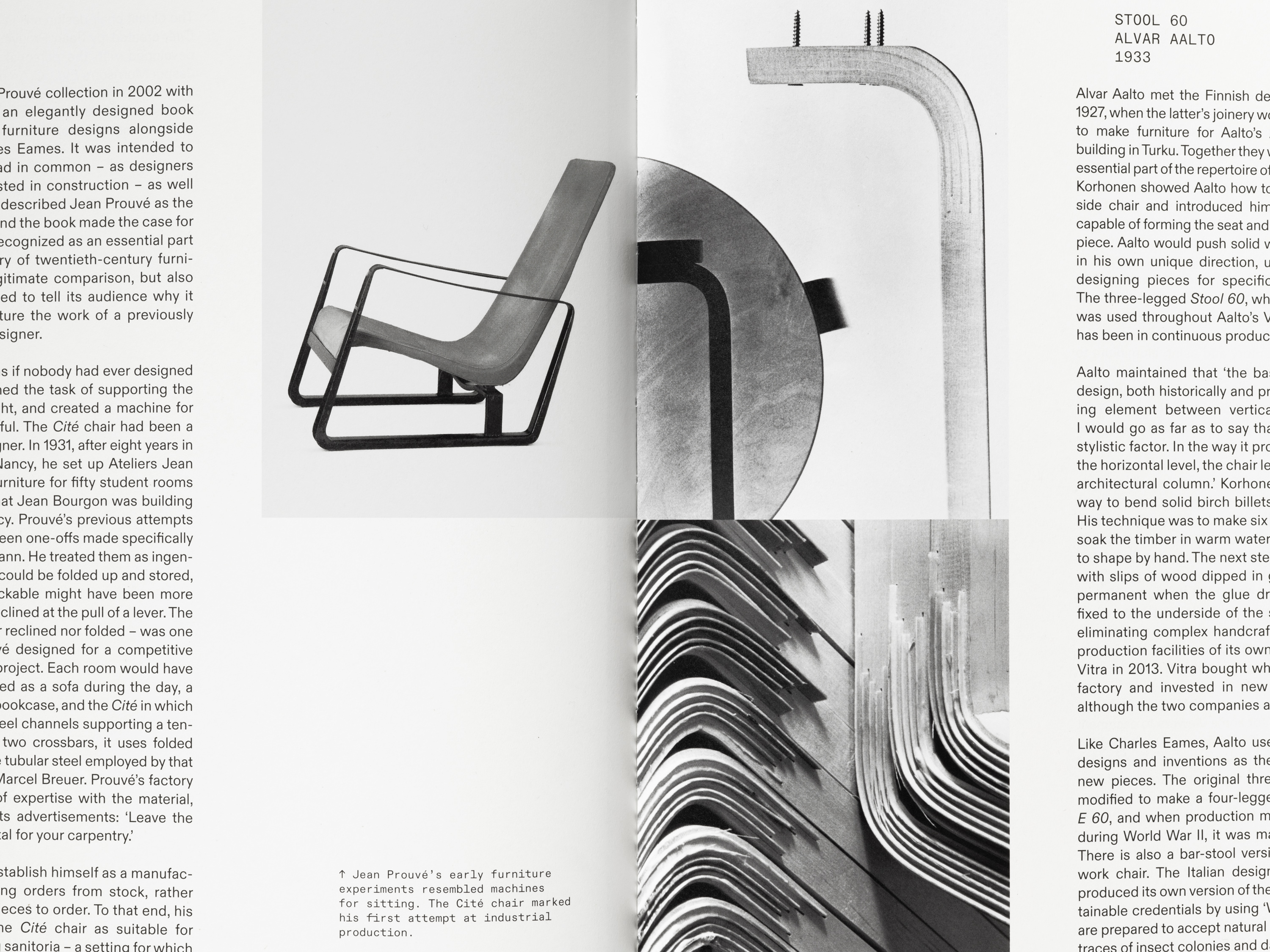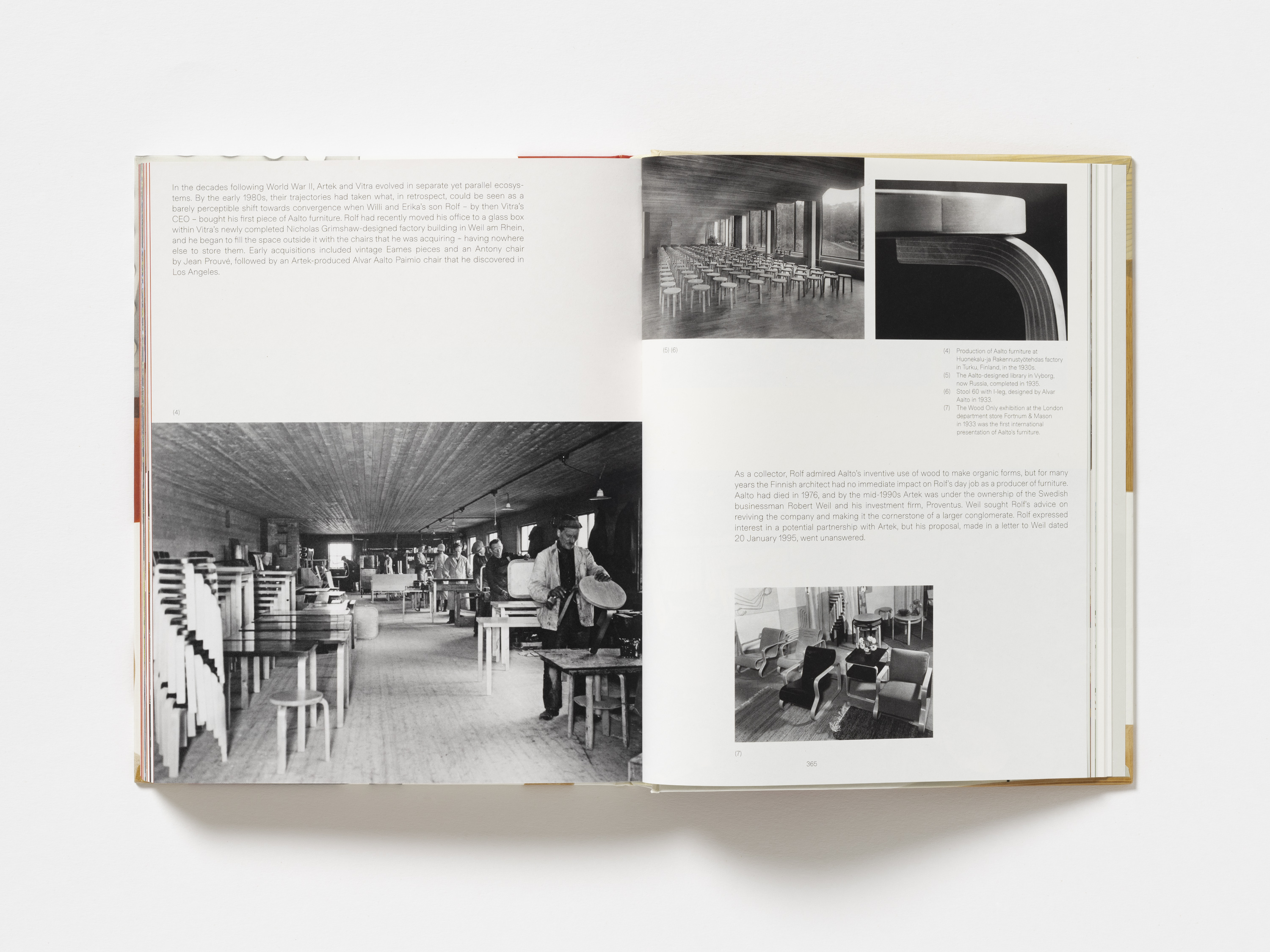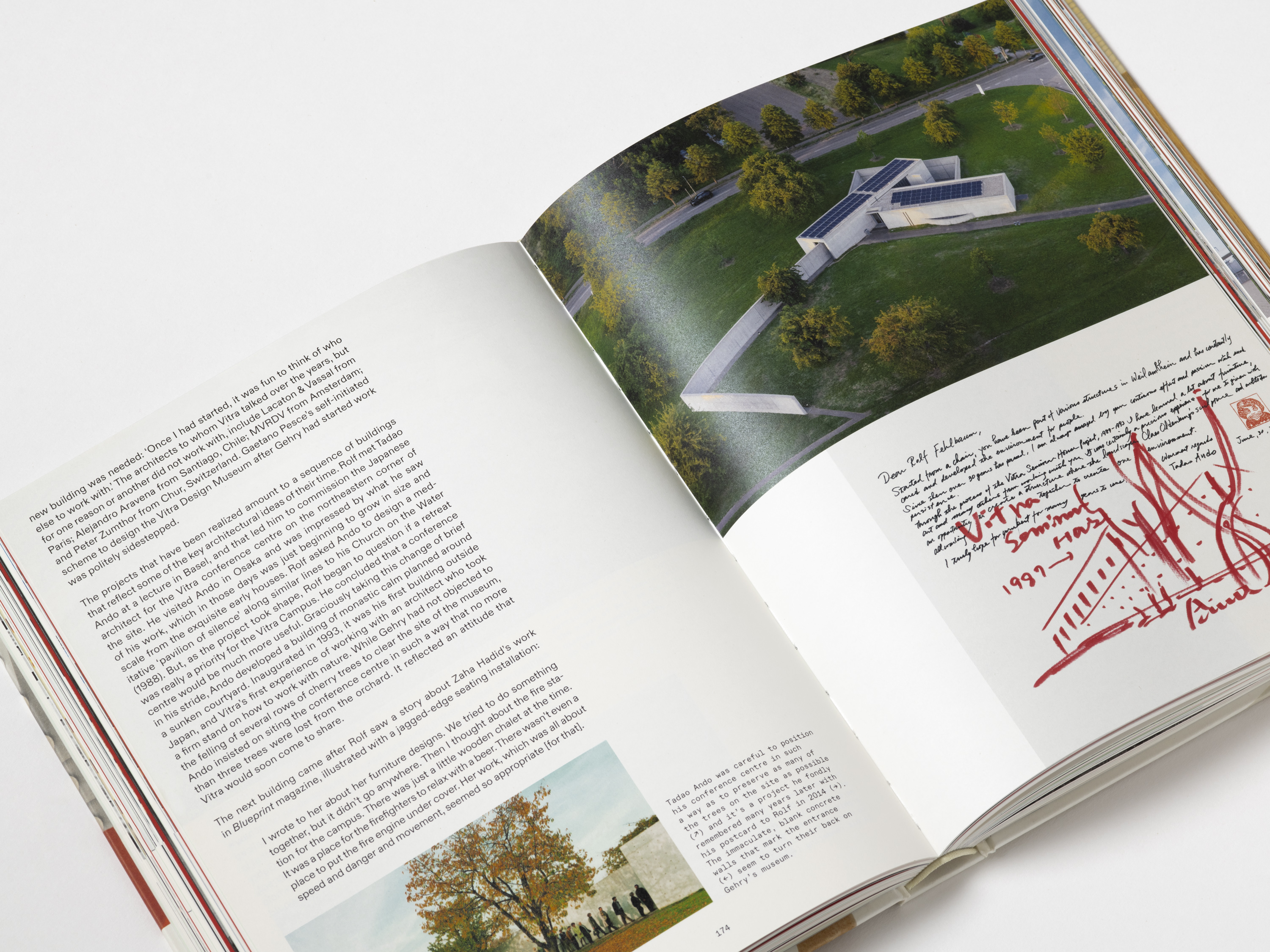 The cover features details of key products from Vitra’s history, highlighting the inventive production techniques pioneered by the company. The red of the Evo-C chair (by Jasper Morrison, 2020) is matched precisely to the chair itself, while the embossed Vitra logo echoes the mark found on their products. Chapter openers also feature silhouettes of products and architectural elements, further emphasising the breadth of Vitra’s work.