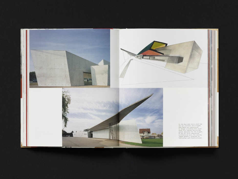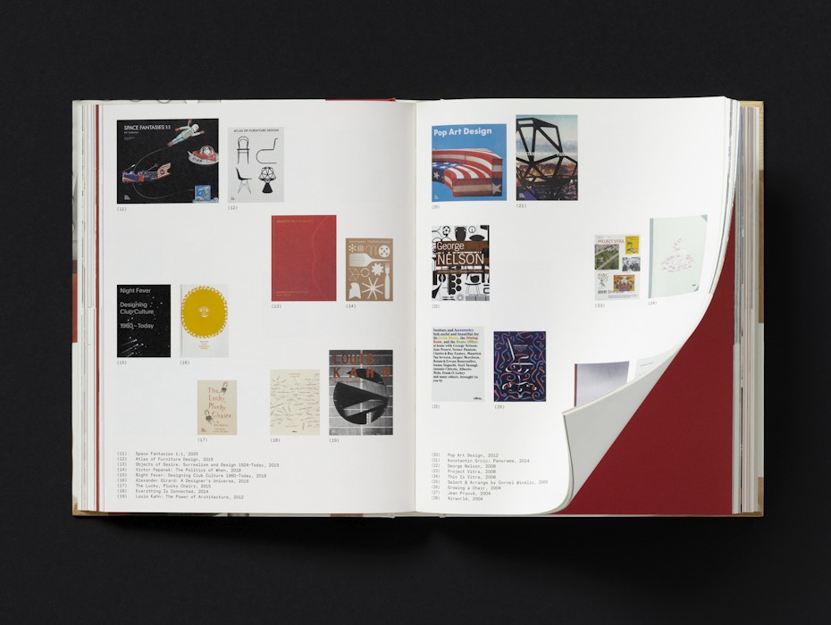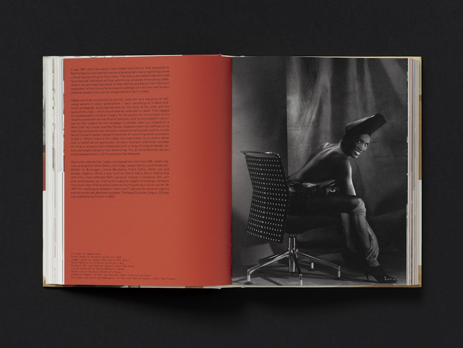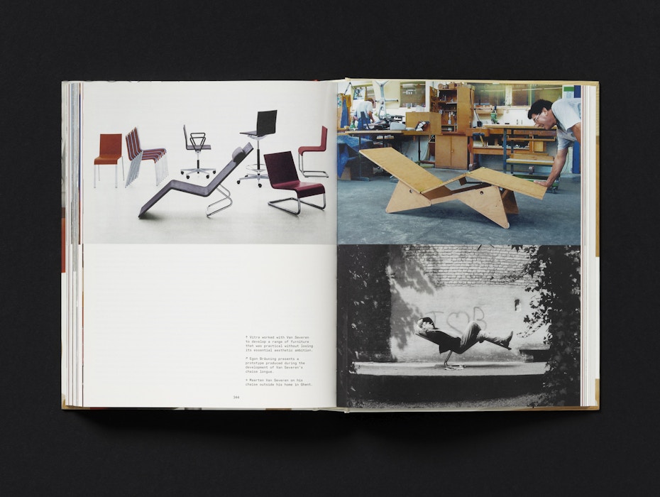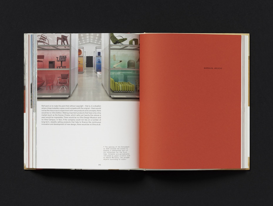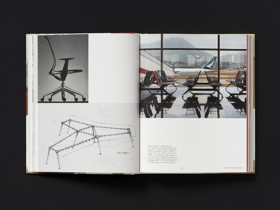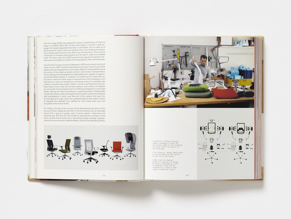 The cover features details of key products from Vitra’s history, highlighting the inventive production techniques pioneered by the company. The red of the Evo-C chair by Jasper Morrison is matched precisely to the chair itself, while the embossed Vitra logo on the spine echoes the mark found on the products. Chapter openers feature silhouettes of products and architectural elements, further emphasising the breadth of Vitra’s work.